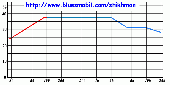 Что получается: при частоте раздела 3 кГц пищалкам нужно лишь 10% общей мощности. Если учесть, что их чувствительность на 3-6 дБ лучше, чем у мидбасов, то получим вообще смехотворную мощность - 3-5% от мощности канала НЧ. Это - максимальные мощности. Если учесть, что средняя мощность сигнала раз в 10 меньше, то получится, что пищалочные каналы будут работать на мощности в 1:100 от номинальной и ниже. А теперь посмотрите в "АЗ" любой график зависимости искажений от мощности - "первый ватт" почти у всех усилителей, кроме "горячих" , отличается повышенными искажениями. То есть в данном случае "неддогруз" усилителя ничуть не лучше "перегруза".
