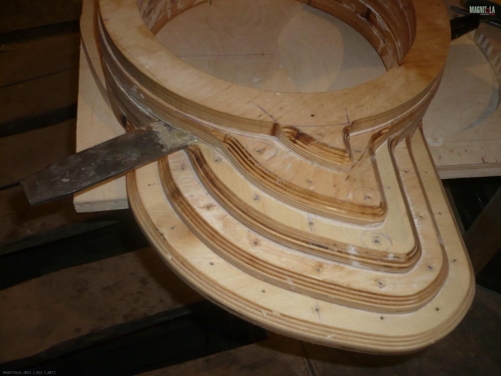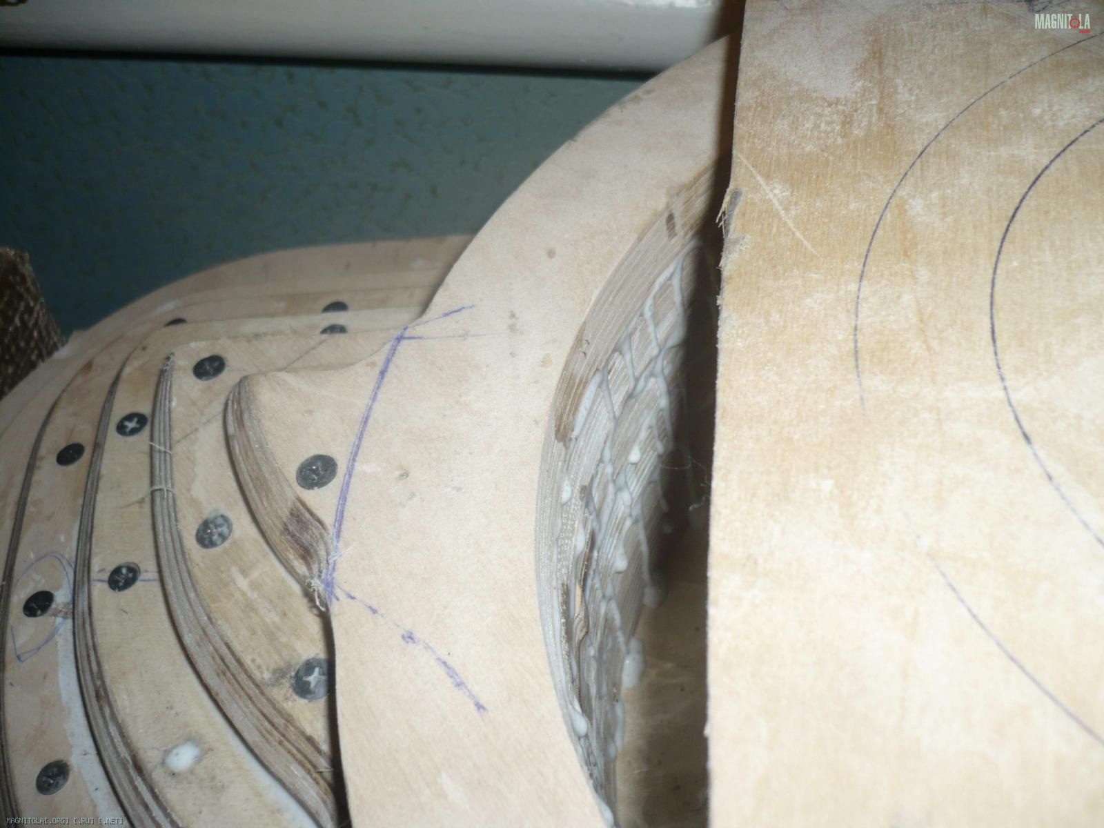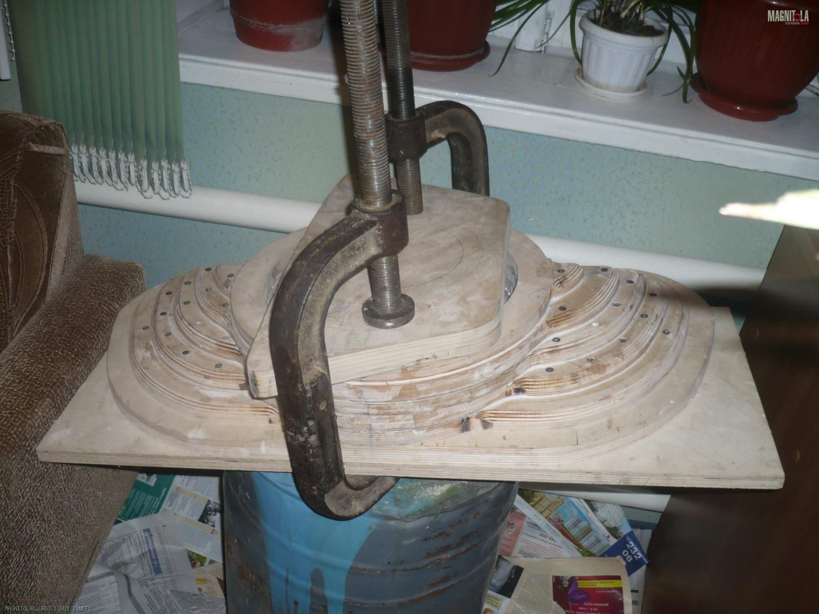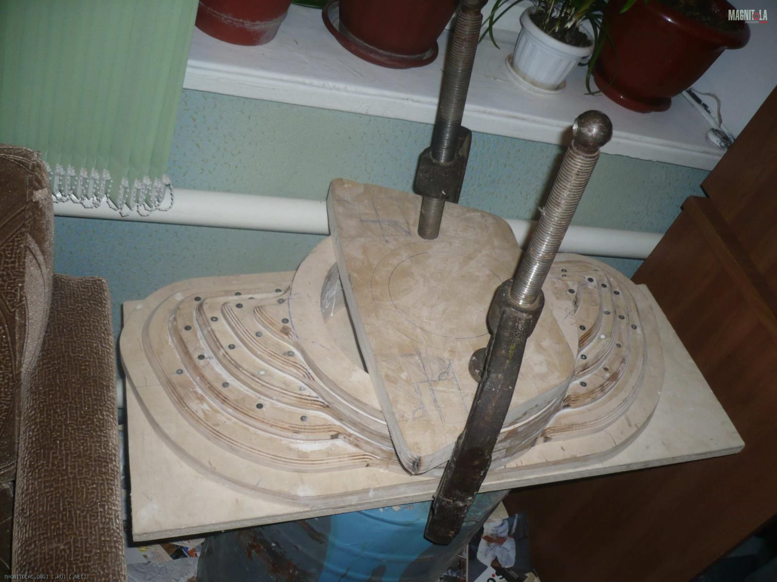 Ну теперь хорошенько всё промазал кисточкой. Благо теперь клей, похож на клей, очень густой, даже сравнивать не стоит, этот как жидкая смятана, и не так быстро впитывается и ложится хорошим слоем, тут сразу ясно, что уже так легко без повреждения слоя фанеры не оторвёшь.) воообщем стянул саморезами, на этот раз все целы!) Да затянул хорошенько воронком струбцины, занёс домой сохнуть к батареи.