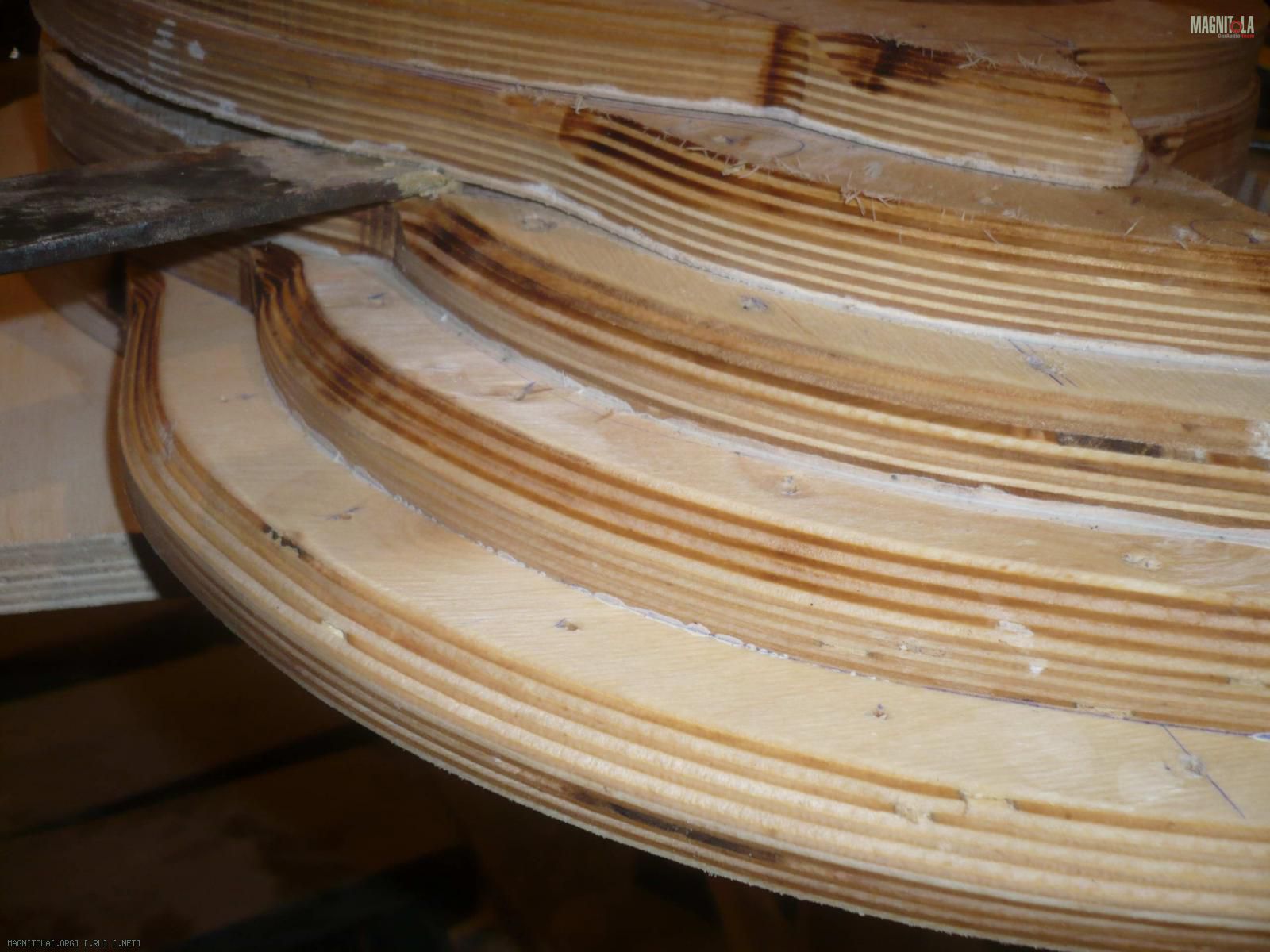 Т.к. я задумал доворот, то я решил слоить слои фанеры, склеивая между собой на ПВА, потом при помощи обычной пилы по дереву, распилил под углом, подравнял фрезером и дошоркал при помощи наждачки, т.к. наждачку на стол прижал и по ней водил своей стенкой, до тех пор пока не скрылись неровности.