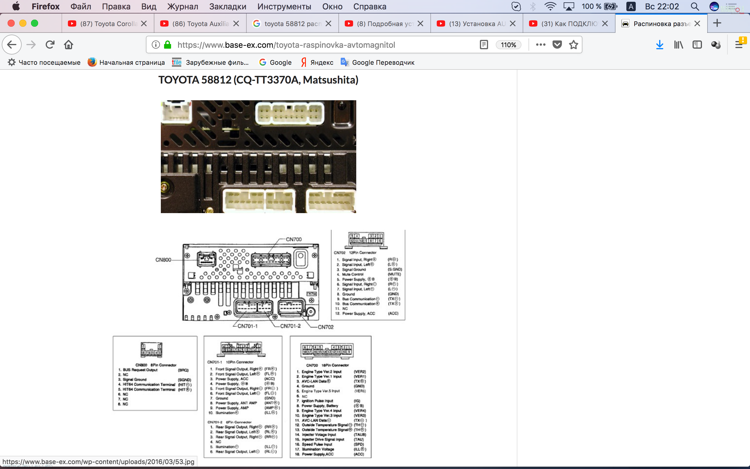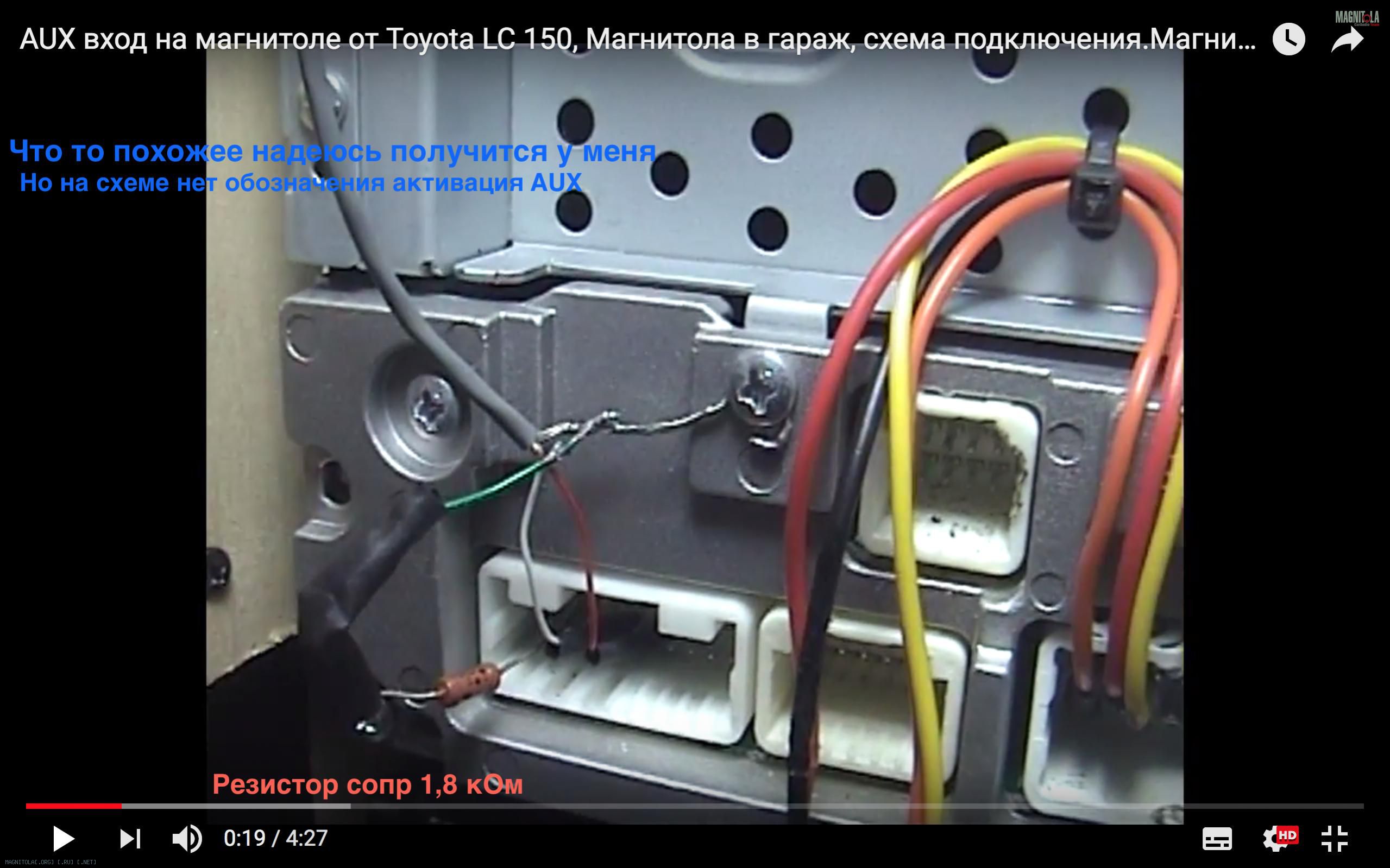 С целью соорудить своими руками AUX подключение в старенькой тойоте (2004г.) я покопался в инете, насмотрелся как люди бюджетно за 10 минут припаивают 3 провода для 3,5mm Jack. Но перед разборкой устройства, я хочу всё таки по-простому попробовать подсоединиться через гнездо CD-чейнджера, как это видел на примере других автолюбителей. Нюанс в том что, мало подать аудио сигнал на соответствующие пины. Нужно как бы дать понять головному устройству, что подключен чейнджер. Верю, что теоретически это возможно. Приготовил разных проводков, 5-ти контактный разъем и даже 2Ом сопротивление, как сделано у человека с LC 150 https://youtu.be/-i2L5LgHMHI В общих чертах всё это похоже, но чуть различается Если вам есть что посоветовать в моём случае, то я буду весьма благодарен. Признаюсь что сам прозвонить контакты не умею-боюсь, не хотелось бы сгоряча испортить рабочую вещь, поэтому хочу заручиться поддержкой бывалого человека