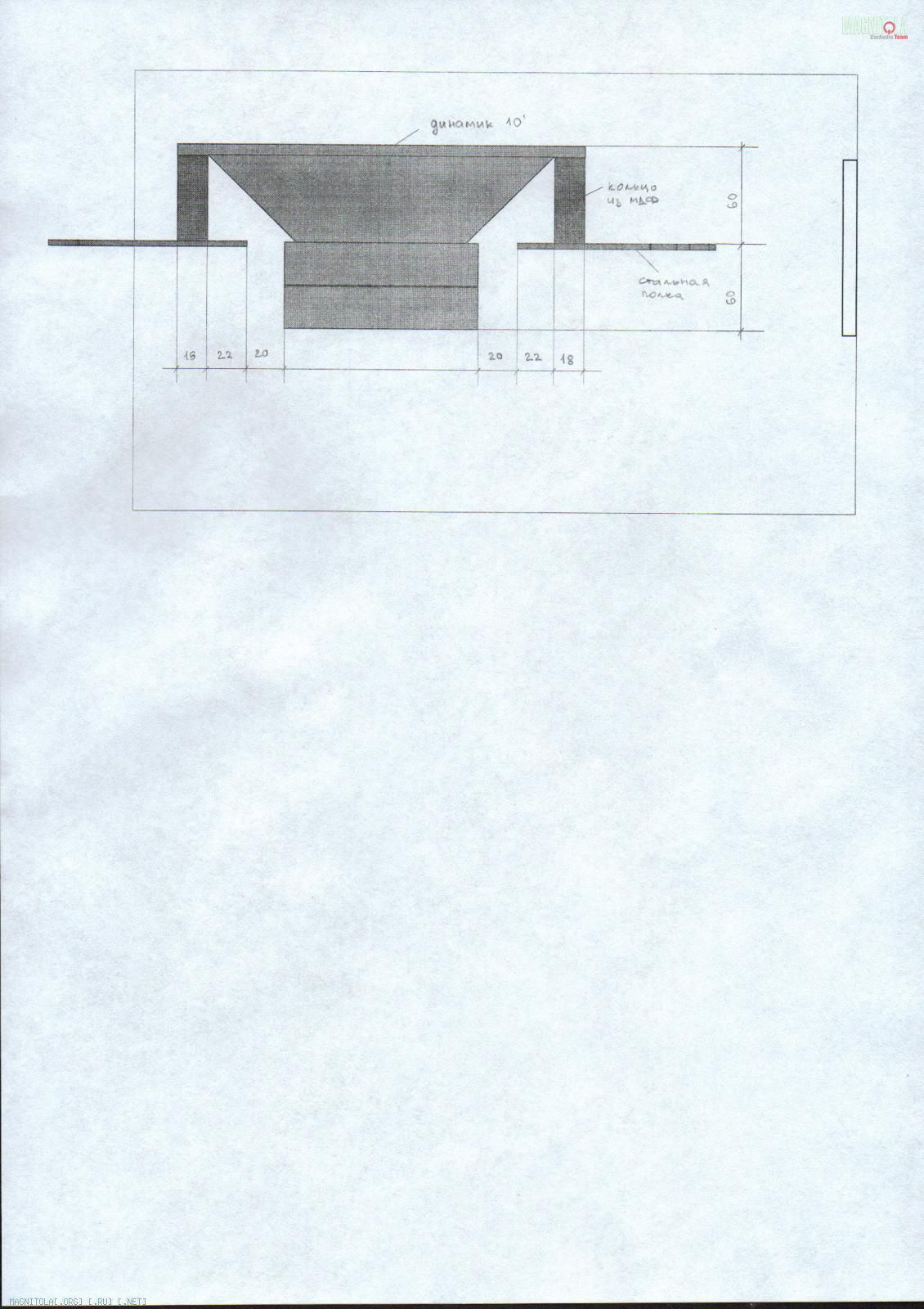 Сабвуферная free air десятка ставится в заднюю железную полку через проставочное кольцо из МДФ (высотой 60 мм). Что это дает? Это приподнимает динамик над заводским отверстием (диаметр которого 190 мм) в железной полке таким образом, что сам динамик входит в полку примерно на уровне магнита, от которого до кромки полки остается зазор около 20 мм для прохождения воздуха. См. рисунок.