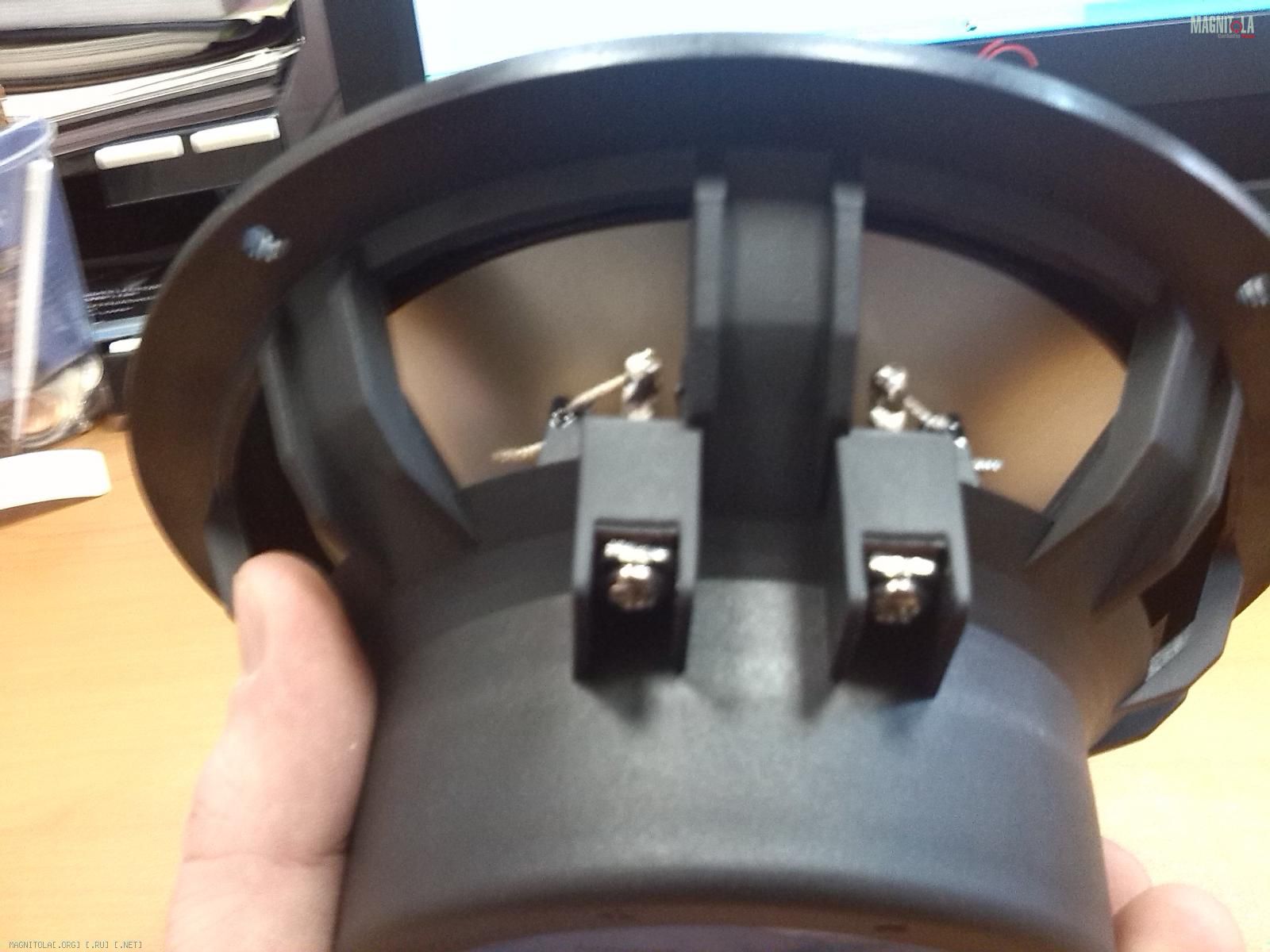 Корзина на мой взгляд сделана сомнительно. Во-первых она пластиковая! Правда пластик необычный - какой то хитроzhопый компаунд. Спорное решение, хотя скорей всего дед Пауль знал, что создавал. По его задумке такая корзина исключает все резонансы! Во-вторых - дурацкие клеммы, точнее их направление. Полярность вообще подписана сверху на магните, при монтаже крайне неудобно! Зато сделаны они надежно - не отвалятся.