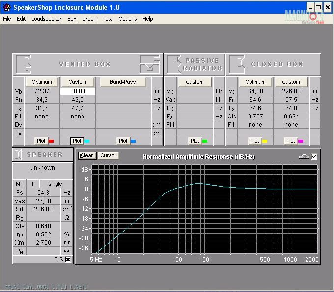 Результаты моделирования работы Profile 69 в стандартном салоне объясняют успех «Ягуара» из 2004 года. В режиме free air овальный сабвуфер даёт мощный подъём к 40 Гц, а отсюда и ниже дубасит ровно и неутомимо до глубин инфразвука. При этом вдобавок к опорной чувствительности идут до 10 дБ (35 Гц) акустического усиления.