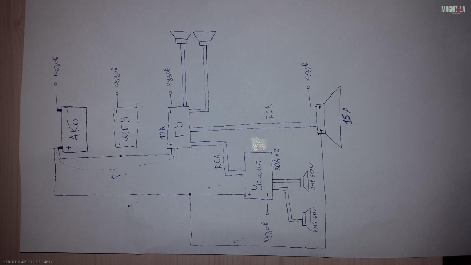 2) На схеме указал номиналы предохранителей на всех активных устройствах. На усилке 2х30А (буду задействовать только 2 канала из 4, но для расчета лучше принять 60А, правильно?). На сабе 15А))) Каким сечением все таки лучше кабель? От АКБ хочу тянуть один кабель, потом болтом под сидушкой пассажира разделить и один до саба, другой до усилителя. Правильно ли я понимаю, что в данном случае понадобится только один предохранитель (возле АКБ)?
