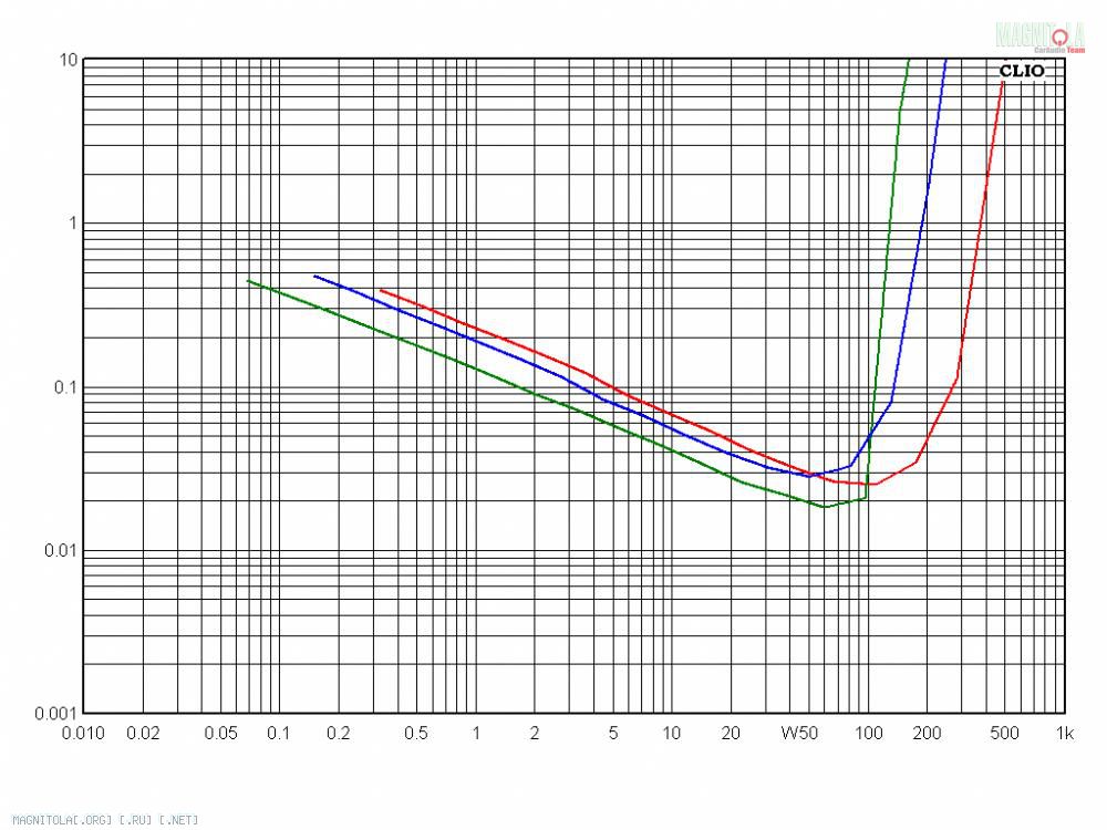 Результаты измерений четырехканальника недвусмысленно намекают о том, что усилитель ближе к классу В – паразитные гармоники есть даже при небольших уровнях сигнала и остаются почти постоянными в широком диапазоне выходных мощностей. Их спектр простирается достаточно высоко, хотя уровень в целом невысокий, это будет видно чуть дальше, на графике КГИ. Вообще, тут достаточно тонкий баланс между стремлением сделать "экономичный" усилитель с минимальным током покоя, но при этом не испортить звук. В конечном счете, покажет прослушивание.