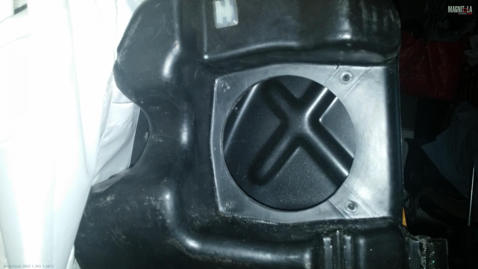 Итак, короб сделан из пластика, имеет 2 отверстия под динамики и 1 выход посередине, который выводит звук в салон. И вопросов бы не было, если бы не одно НО! Минимальные размеры под динамики! Ниже я приведу фотографии самого саба и чертежа динамика, который, как мне сказали, должен там стоять. Выходит, что динамик нужен 4"-5".. Естественно под них пойдет отдельный усилок.