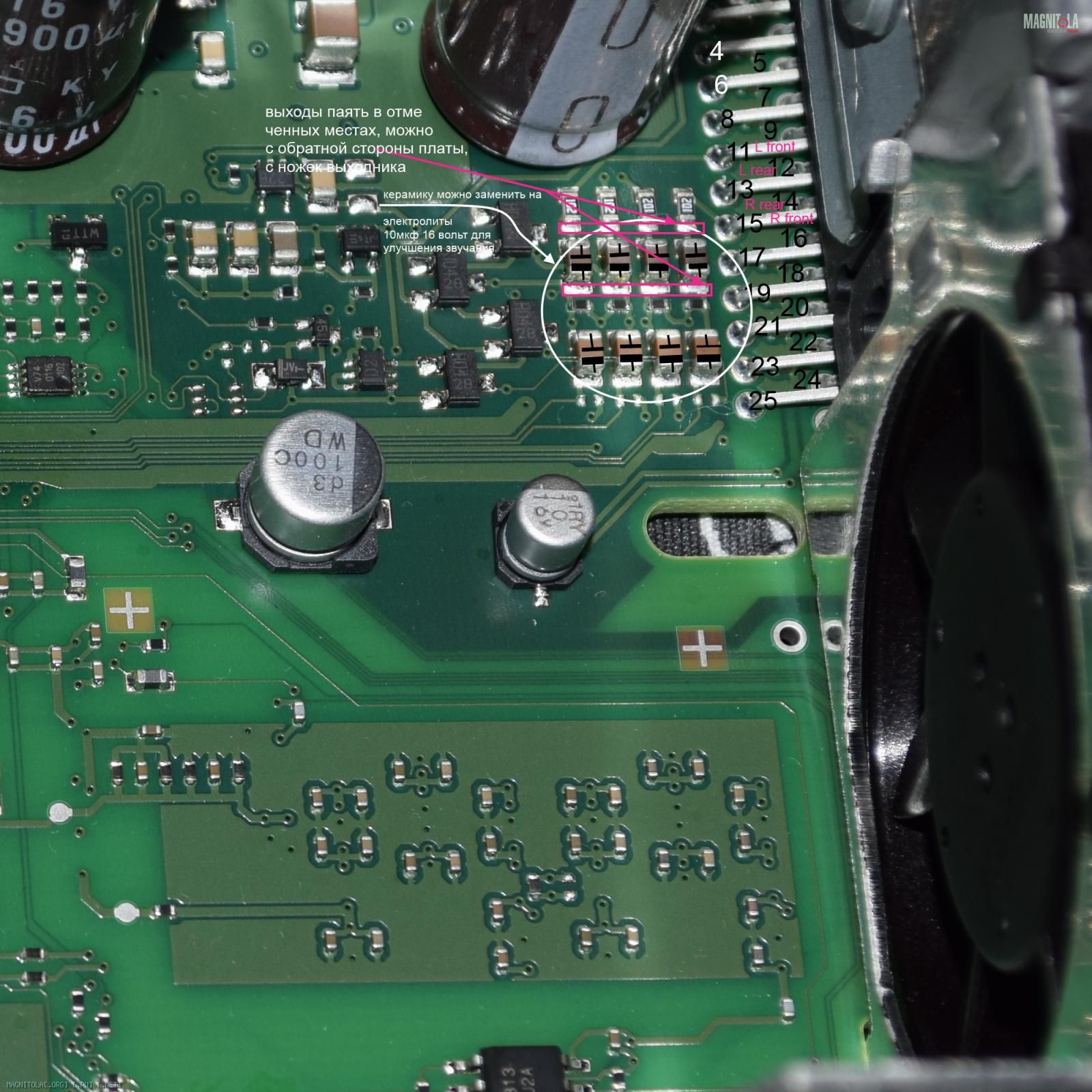 Как организован линейный выход не скажу. Отдавал в мастеру. Потом другому. Второй сказал, что все сделано по уму. Сигнал взят сразу поле процессора и развязан кондерами. Если дело в распайке, завтра сниму ГУ и сфоткаю