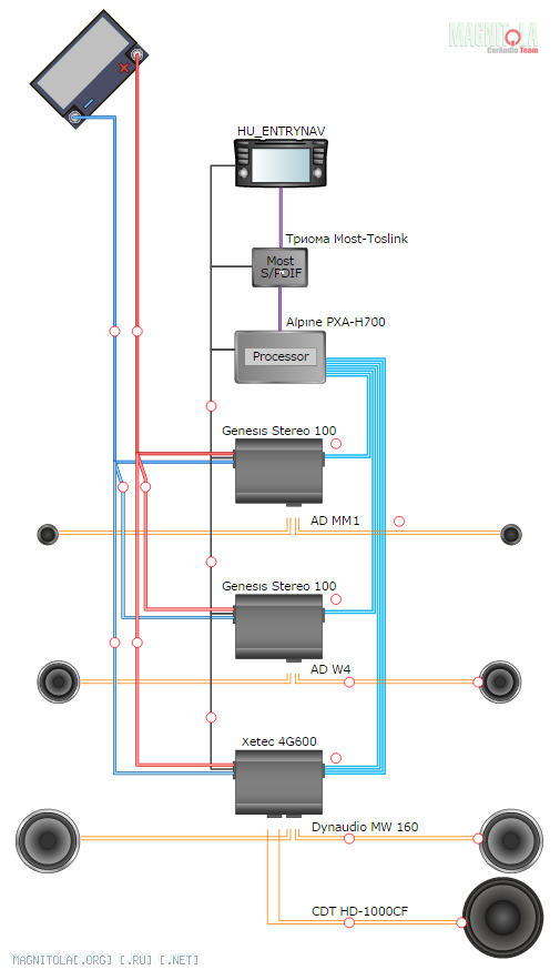 ШГУ, с которой через адаптер Триома Most-Toslink идет оптика на процессор Alpine PXA-H700Саб CDT HD-1000CF (ЗЯ)Миды Dynaudio MW 160 в ящиках а-ля стелс под сиденьями (общий объем ящика в районе 10 литров)На саб и миды стоит усилок Xetec 4G600.СЧ AD W4 в штатных местах в дверях. Усилок на СЧ Genesis Stereo 100ВЧ AD MM1 в подиумах в уголках зеркал. Усилок на ВЧ Genesis Stereo 100