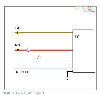 Попробуй такую схемку. Ставиш два диода, ACC запитываешь от штатной проводки. Магнитола включается только с ключем в зажигании. Но после включения можешь ключ вынуть и магнитола будет продолжать работать. И в состоянии покоя кушать не будетhttp://magnitola.org/picture.php?alb...pictureid=1115