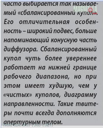 "На высоких частотах длина звуковой волны становится сопоставимой с размерами самого твитера, и если динамик расположен под углом к слушателю, излучения от ближнего и дальнего краев мембраны будут складываться. На слух это заметно как изменение характера звучания при развороте динамика. Чтобы уменьшить этот эффект, перед мембраной иногда делают небольшое апертурное тело, задача которого – затенять отдельные области купола, когда тот немного развернут. Апертурное тело обычно расположено точно перед центром мембраны, но может быть и несимметричным, что позволяет в небольших пределах менять характер звучания вращением твитера."