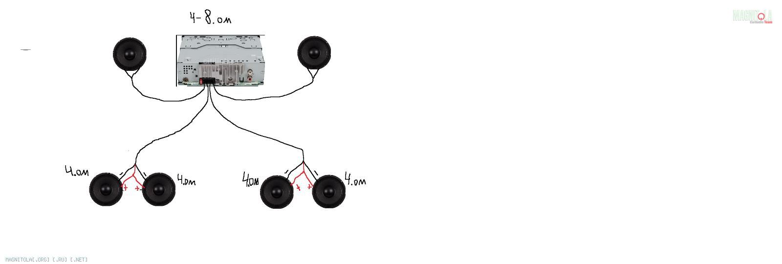 В машине стоит магнитола Pioner DEH-1500Ub, посмотрел в инструкции, допустимое сопротивление от 4 до 8 ом.Стоят 6 динамиков,2 спереди и 4 на задней полке.Подключение к магнитоле на фото в вложении. Как я понял подключение задних динамиков параллельное.Какое общее сопротивление получается и допустимо оно для магнитолы? Вложение 1127928