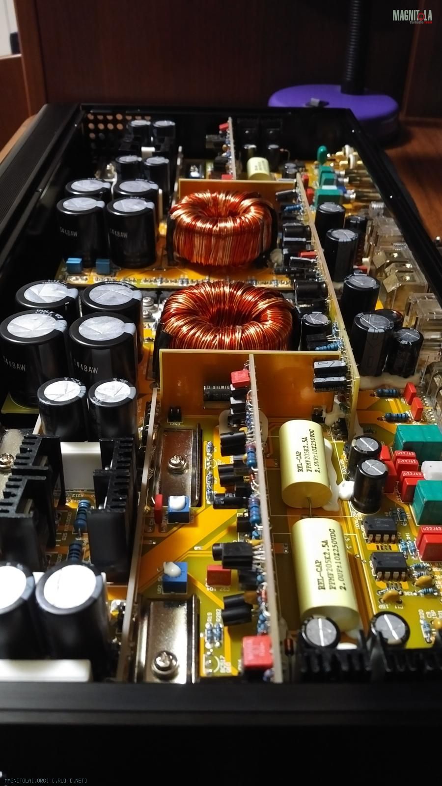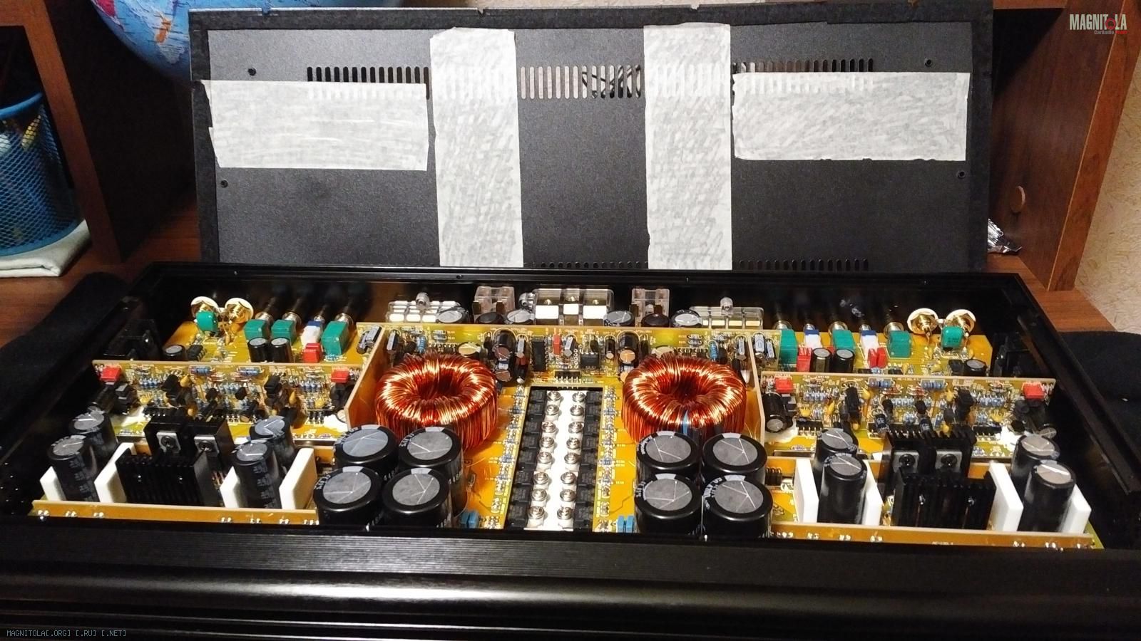 Заклеил аудиофильским скотчем места на крышке где торчат конденсаторы. Хоть и есть расстояние пару мм до крышки, все равно - на всякий случай.