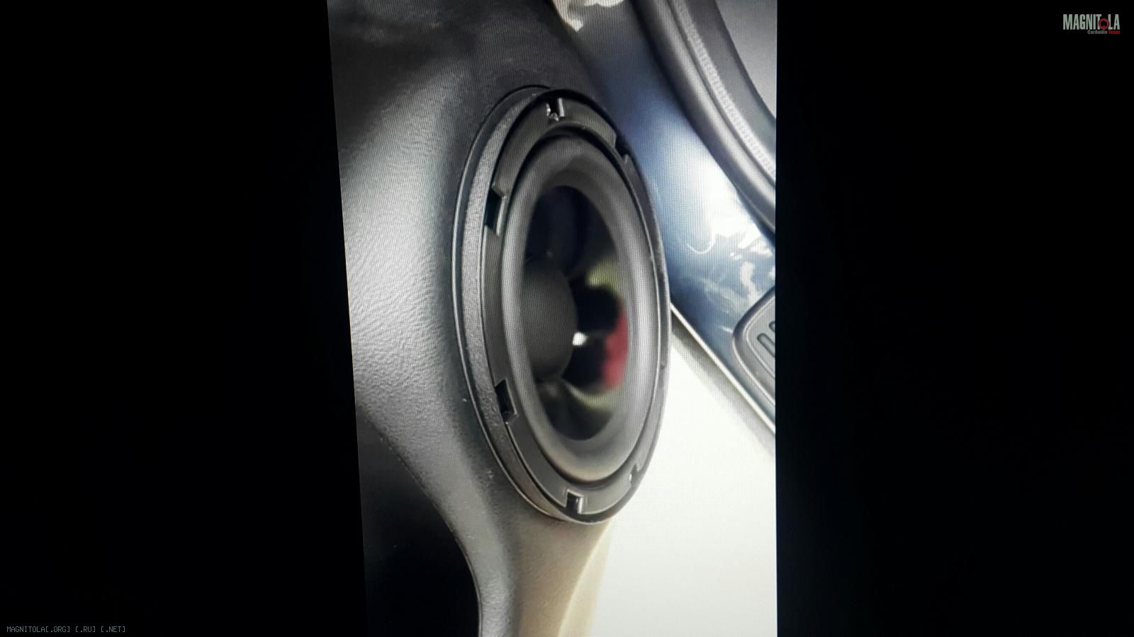 Миды установлены в двери, направлены друг на друга. К двери прикручена площадка из фанеры 21мм, и к ней кольцо из фанеры 21мм. Этот колодец идет от металла до обшивки, а сам динамик прикручен через обшивку к кольцу. Колодец сделан на расширение к двери.