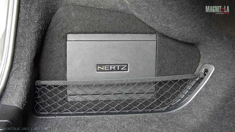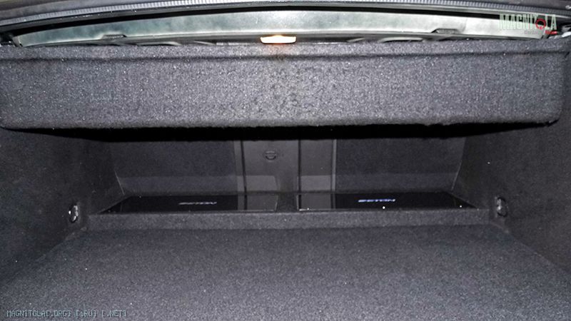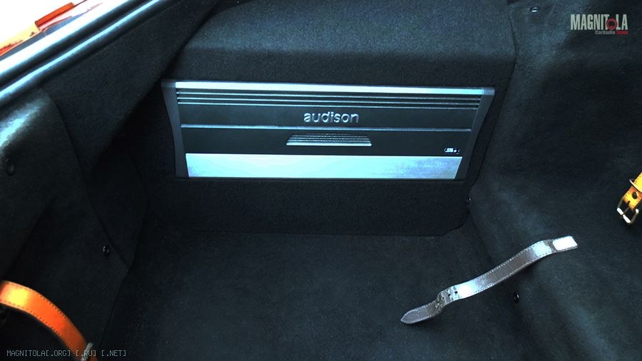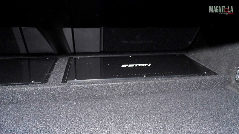 Фронтальная акустика собрана на итальянских компонентах Audio Development: твитеры AD T100, мидбасы AD MM6. Усиление фронта организовано поканально с помощью встроенных кроссоверов в усилителе Eton ECC600.4. Два сабвуферных динамика Hertz расположены в специально изготовленном корпусе под полкой. Усиливает сигнал для сабвуферов Eton ECC600.2