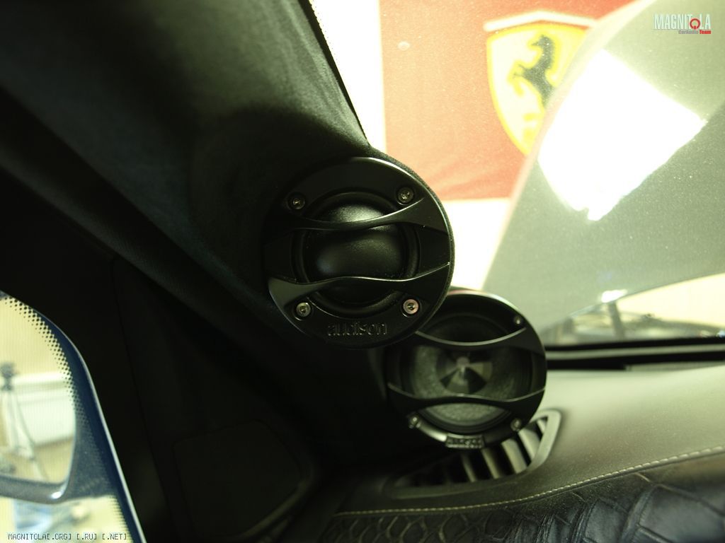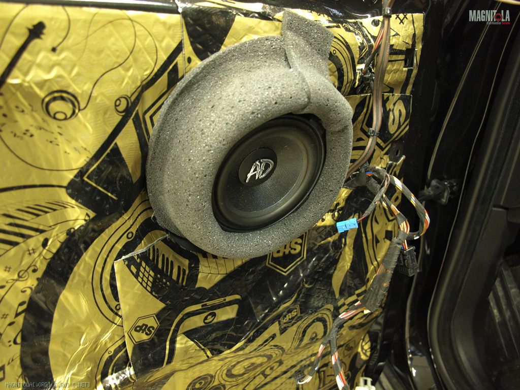 ВЧ Audison Thesis TH 1.5 Violino и СЧ Audison Thesis TH 3.0 Voce установлены в передние стойки, защитные грили покрашены в черный цвет. Усиливает сигнал для ВЧ и СЧ Audison Thesis TH quattro включенный в режим работы в А классе. На подседельники BLAM 200XF работают два одноканальника Celestra RA150m.