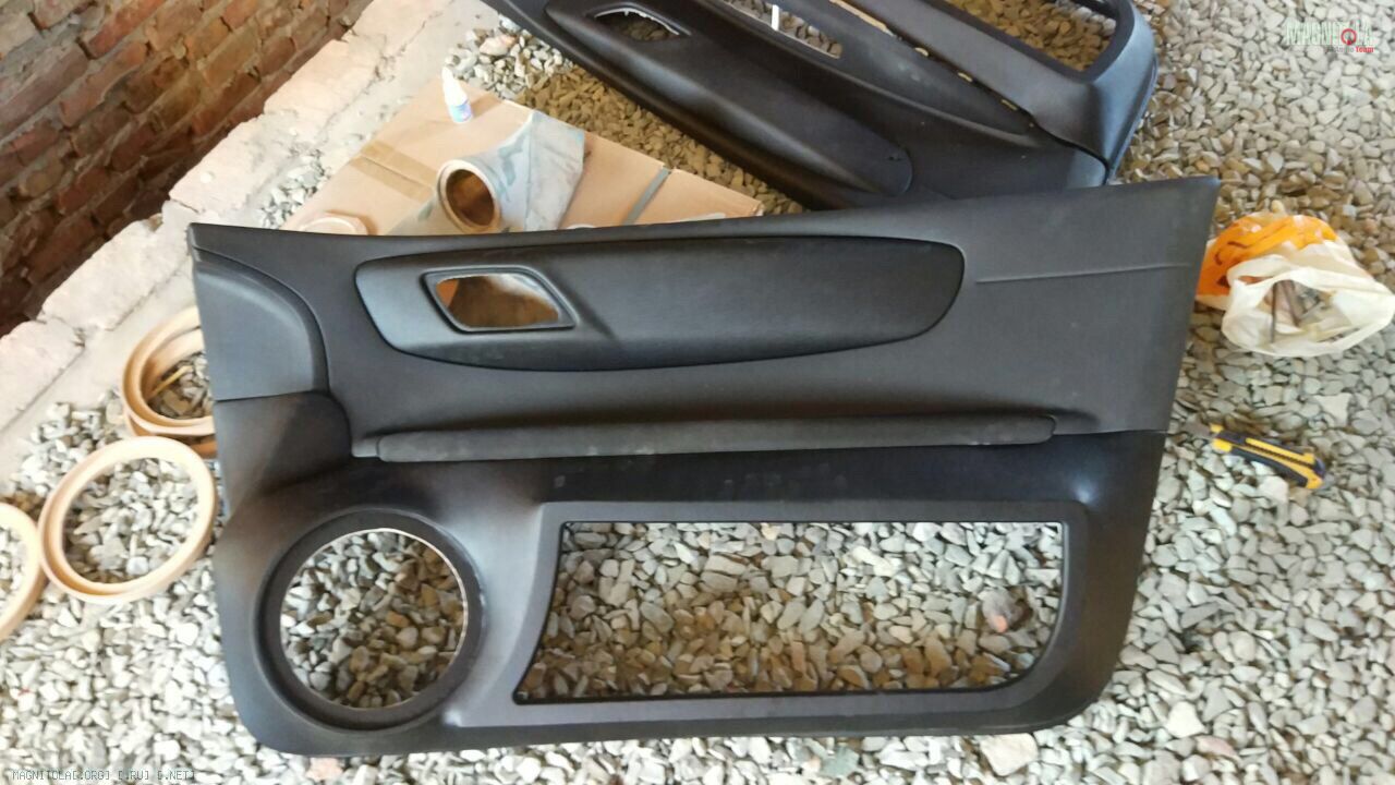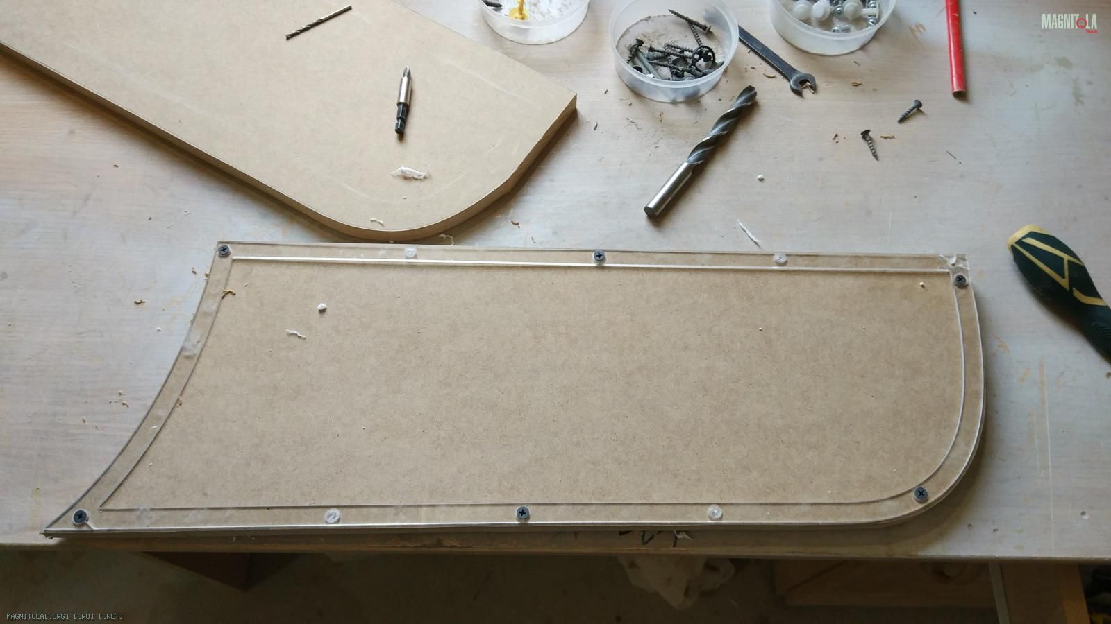 Всем привет! Днями и ночами продолжается упорная работа над машиной. Очень много сил и внимания требует к себе посторонние проекта на SQ. Времени занимает столько, что не было возможности что-то часто постить на форумы. Вот, наконец-то добрался до этого дела. Сегодня расскажу о переделке дверных карт.Форма ЗЯ вылита из смолы и стеклоткани по лекалу двери, толщина вышла почти 1см. Затем выпиливалась фрезером из МДФ заготовка для создания формы дверной карты и первое кольцо для крепления динамика к объему.