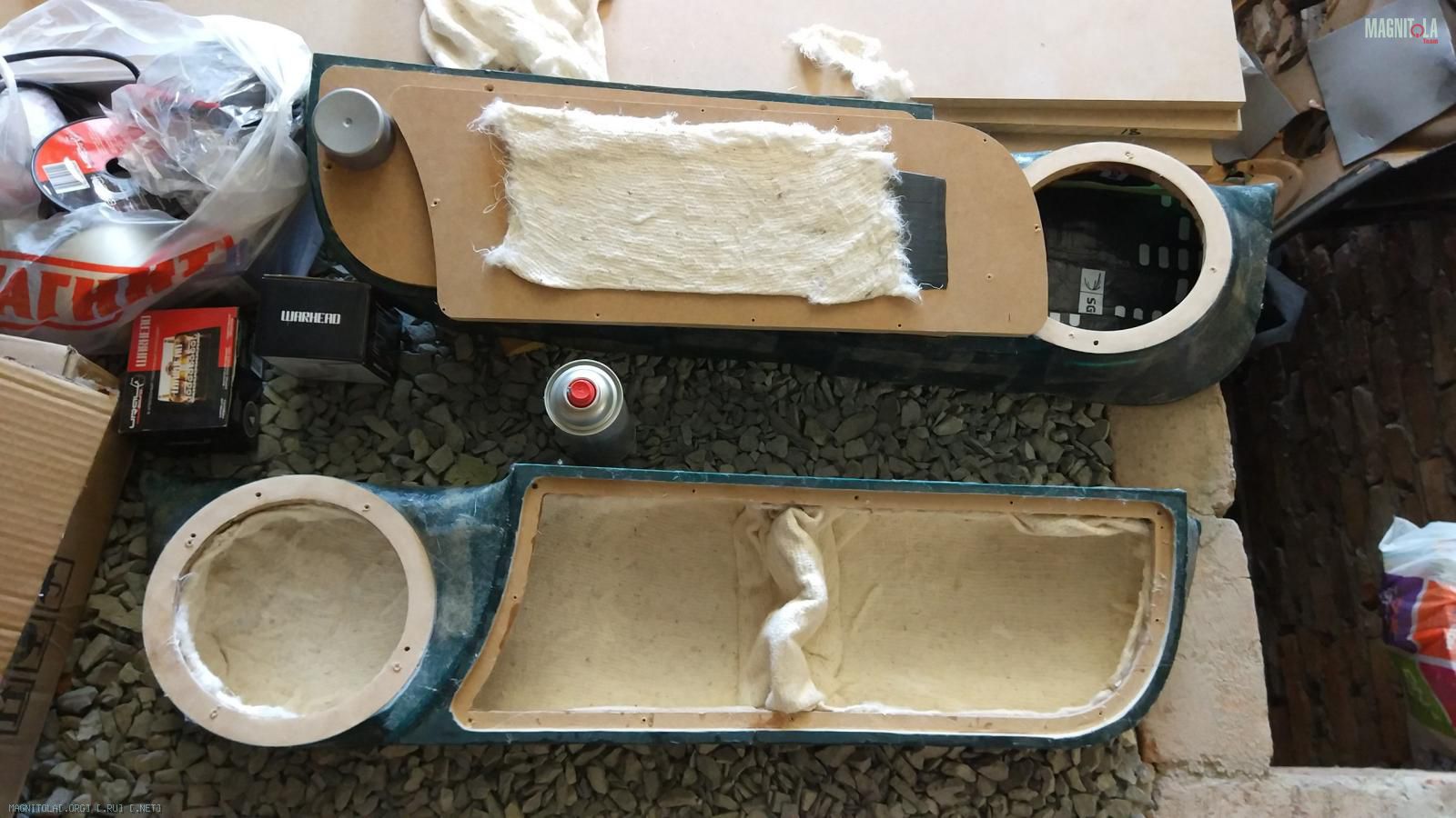 Зашумил данную конструкцию виброй, дабы загасить резонанс ящика, забил тканью, поставил панель акустического сопротивления, потому что объем выполнен в форме трубы, — нужно обязательно разбивать стоячую волну! Все это было множество раз просчитано и промеренно с помощью ноутбука, выносной звуковой карты и измерительного микрофона. Результаты вышли очень не плохие для автомобильного исполнения, но об этом более подробно я расскажу позже.