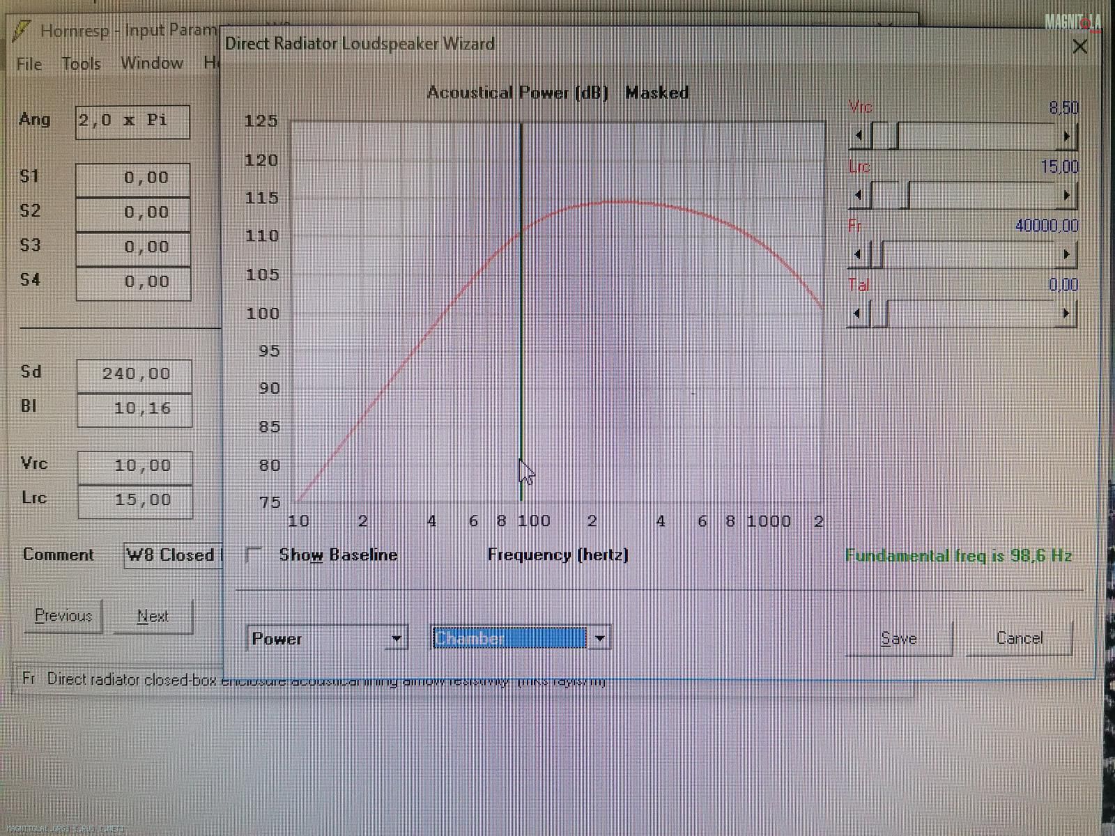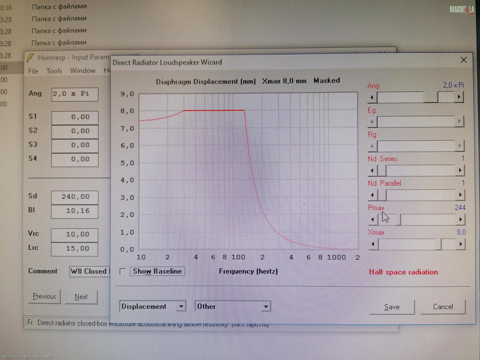Melnik.E, товарищь оформил заказ на Pride W8. Звучание на НЧ определяется ТS параметрами. Они нам известны, устраивают. Так что всё будет нормально, какой-никакой опыт имеется. Правда мощи надо подавать не мало. Hornresp говорит, чтобы диф вышел на максимальный линейный ход в нашем ящике, надо около 250 Вт подать. Но это мелочи, усилки есть. Динамик вроде как 300 Вт, должен выдержать.