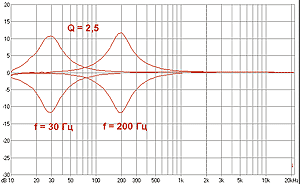 - Параметрический басовый эквалайзер: регулируется не только величина подъёма (и спада), но и центральная полоса фильтра и добротность корректирующей кривой, причем в очень широких пределах. Богатые характеристики параметрического эквалайзера позволяют использовать его не только для коррекции огрехов на АЧХ сабвуфера, но и для маневров с кривой разделительного фильтра.