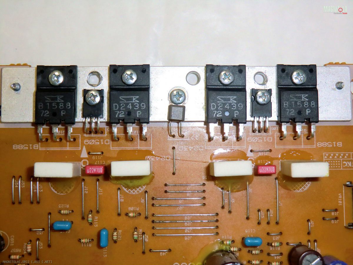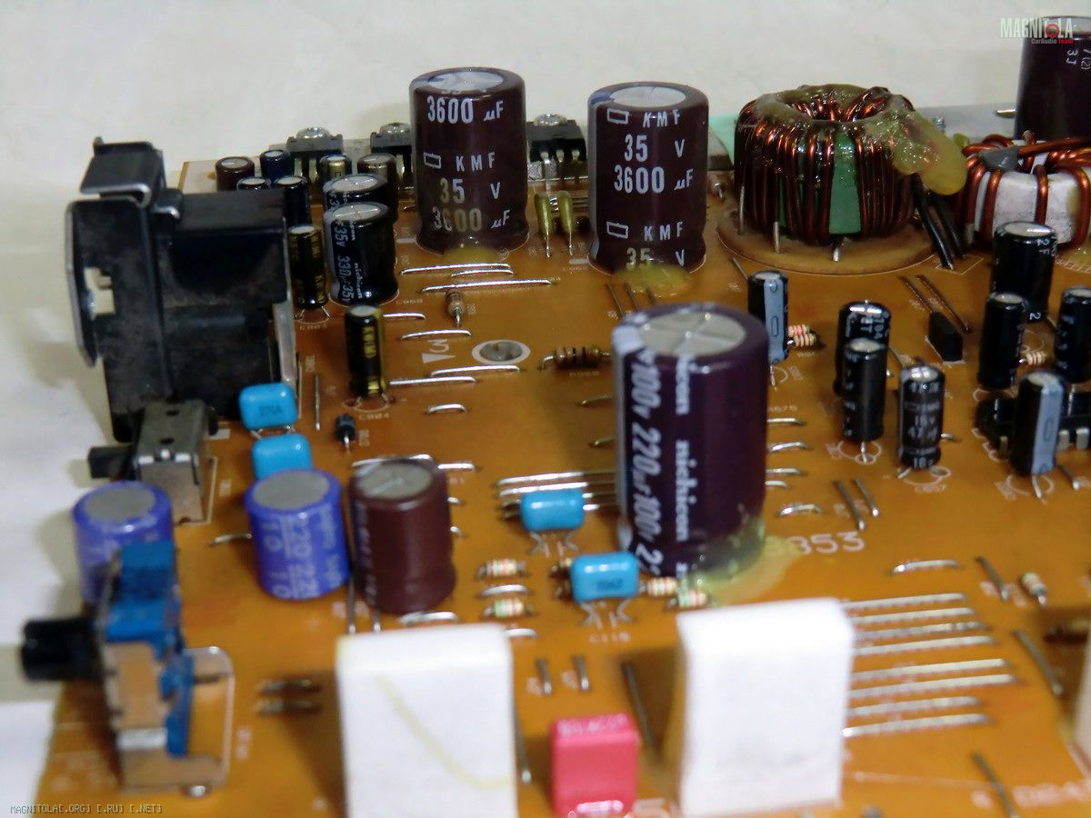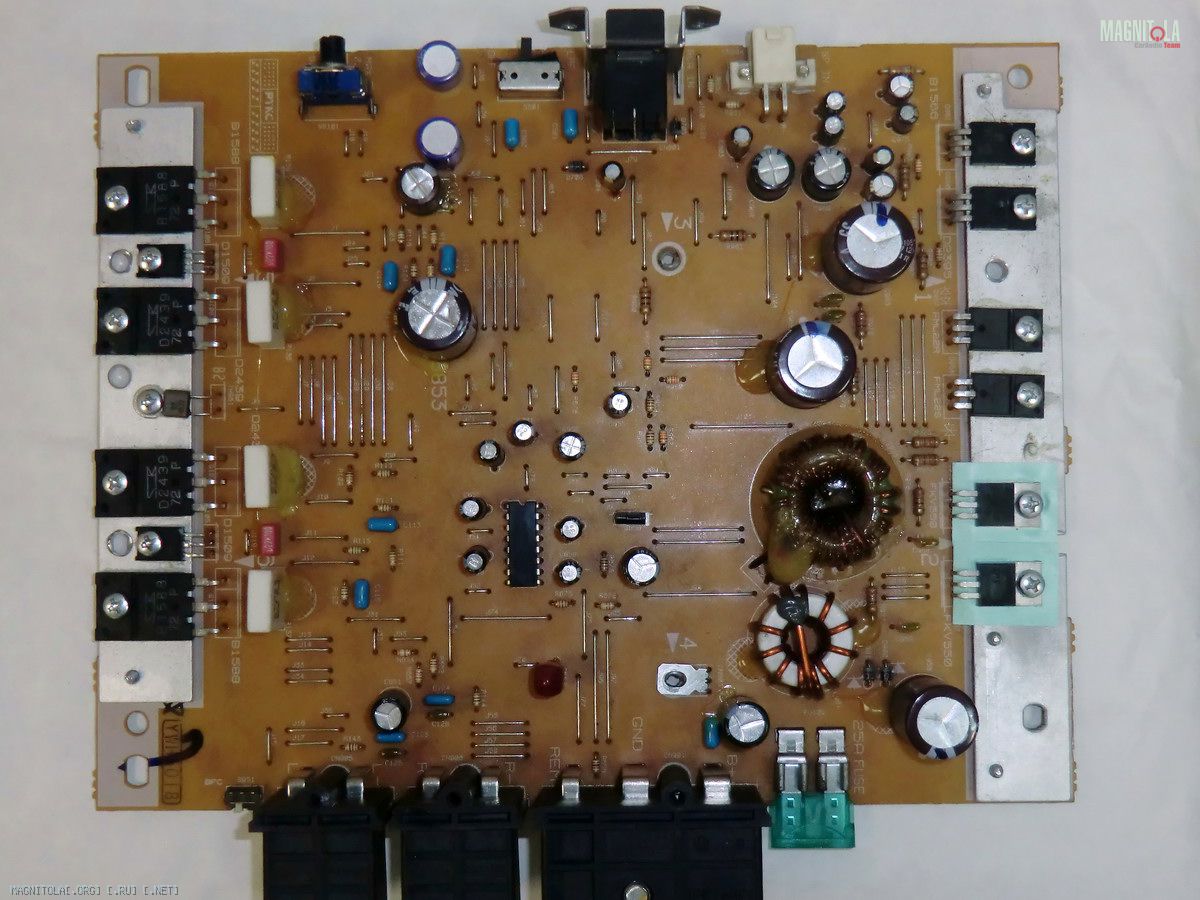 Внутри все отлично: чистая плата отмытая от пыли, Sanken на выходе (ток покоя немного увеличен), емкости все живые (United CHEMI-CON, Sanyo, Nichicon, Elna, Wima), заменены операционники и скорректированная ООС. Кроссовер полностью отключаемый (он в стоке прибит насмерть на 80Гц для мостового режима).