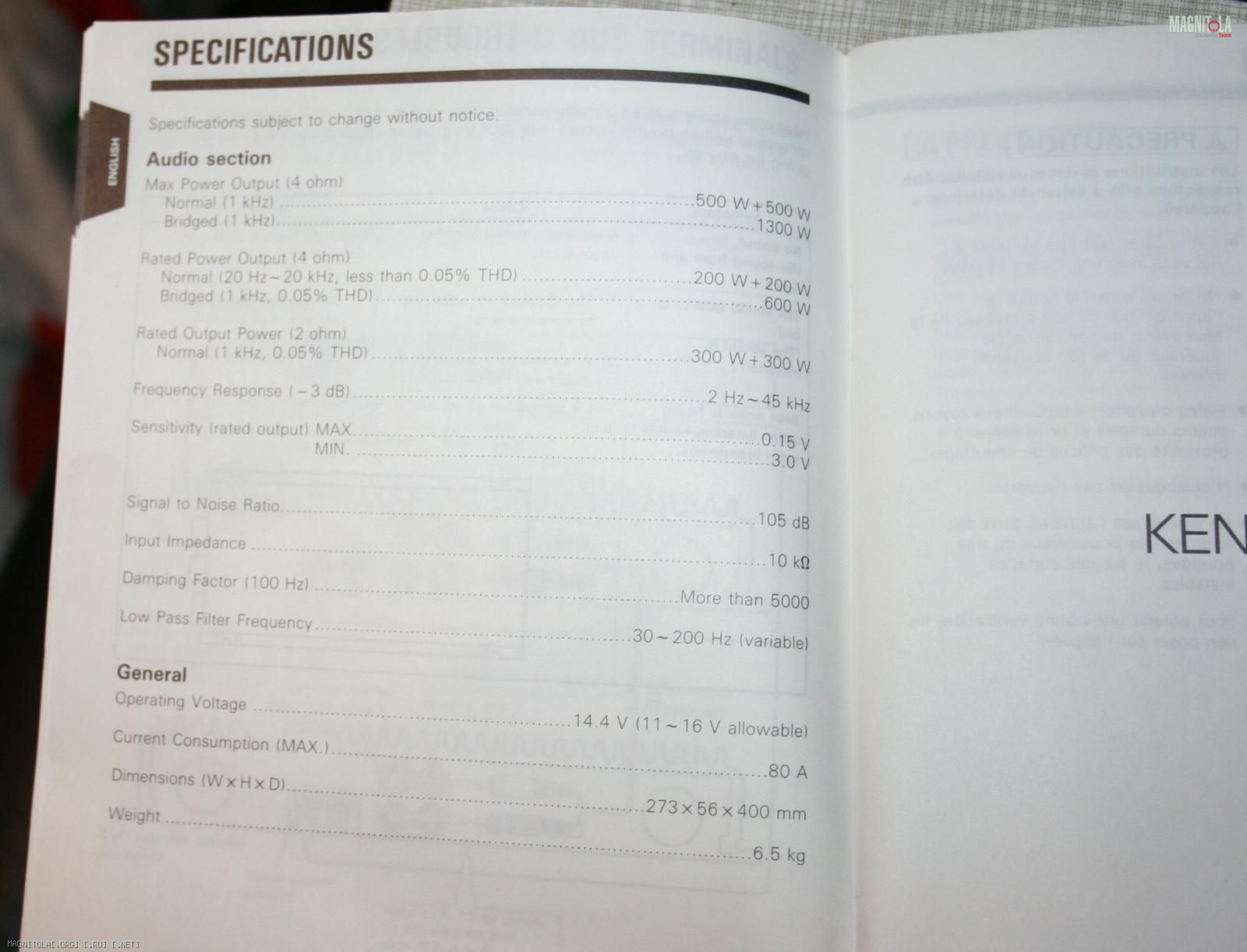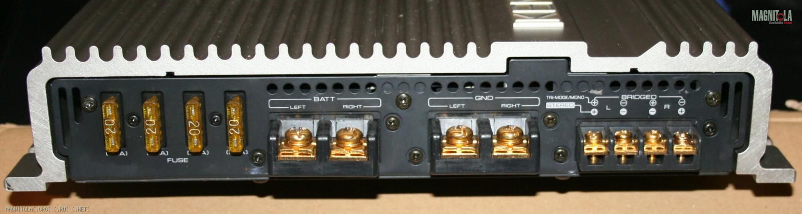 2x250 Вт в 4 ома и более 700 Вт мост при 13.4 В и 1%THD(при работе в мост рекомендуется заменить фьюзы на 4Х30А).Полная спецификация при 12 В на фото.