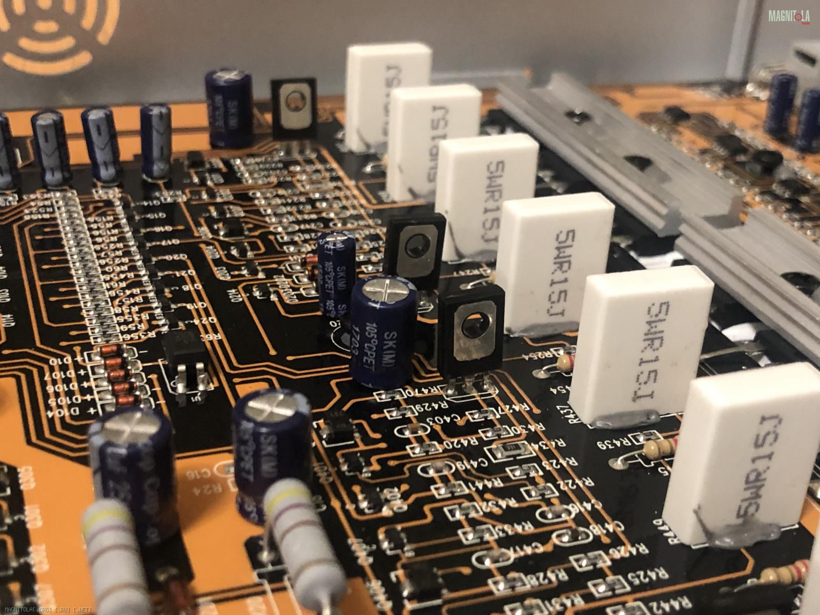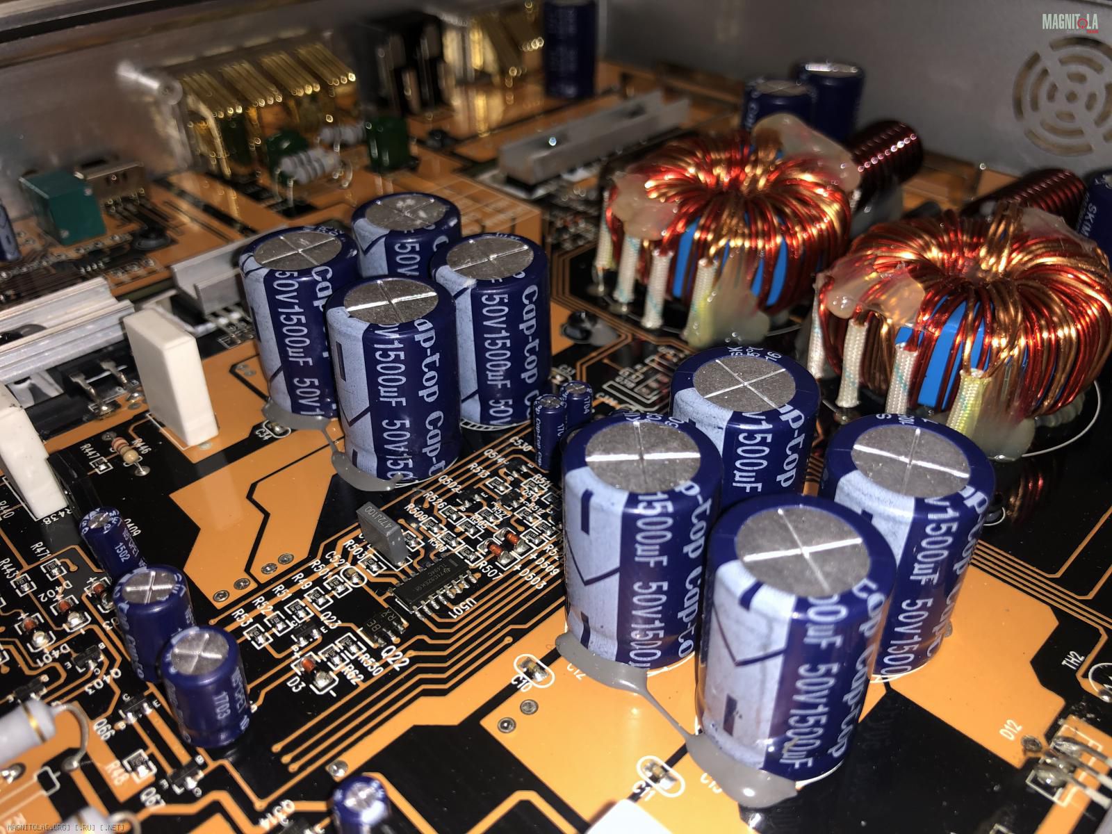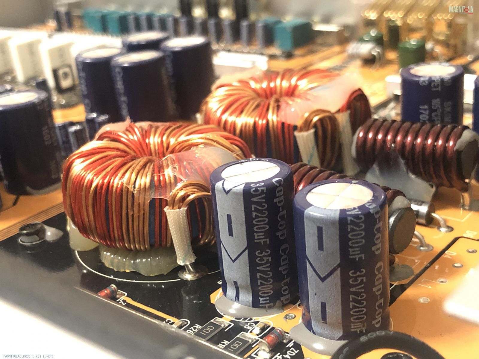 Мощный блок питания, два транса. Электролиты Cap-top (в других усилителях не встречал, судя по названию, ТОПовые), в блоке предусилителя 50 вольтовые, можно не бояться питать саб мостом. ОУ от STMicroelectronics.