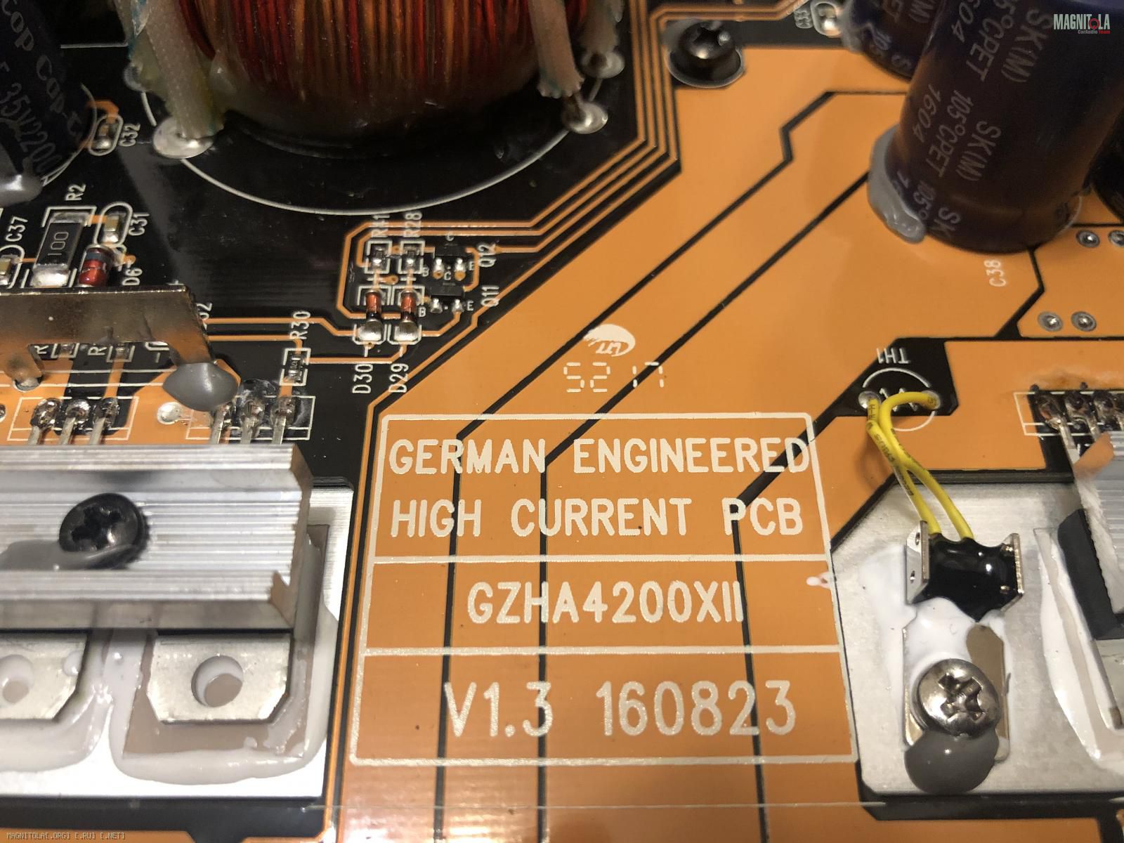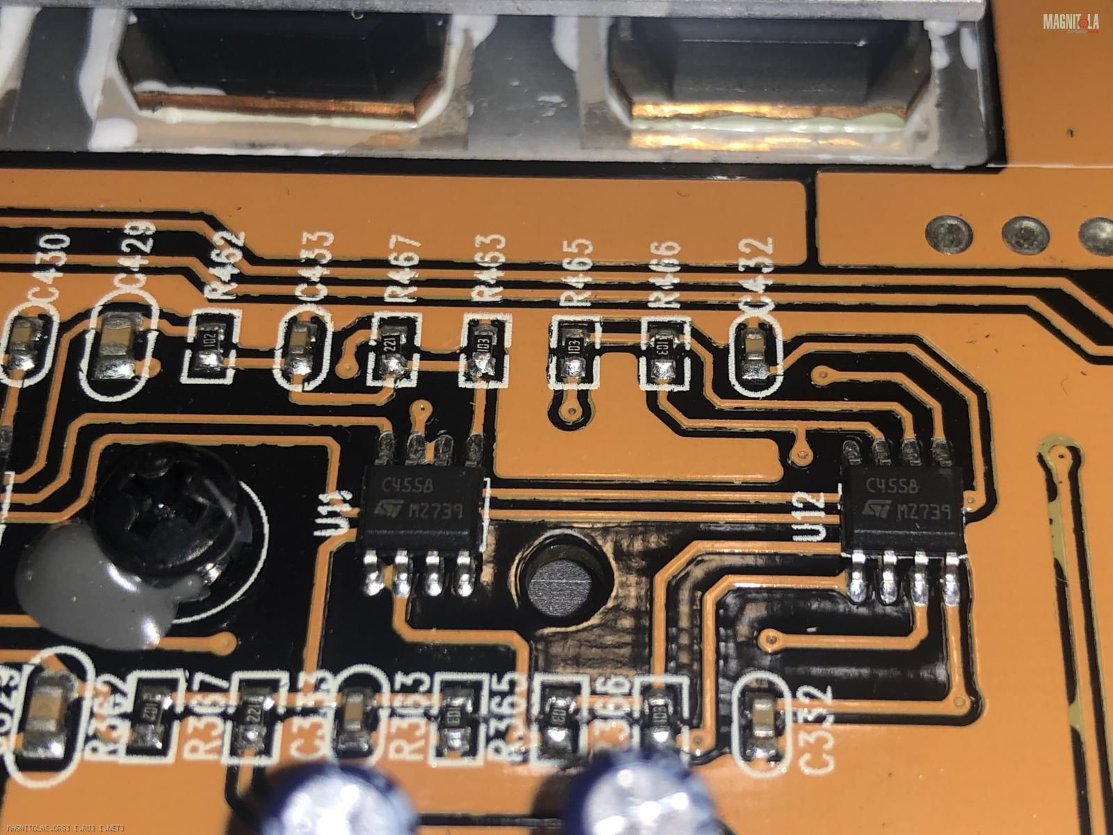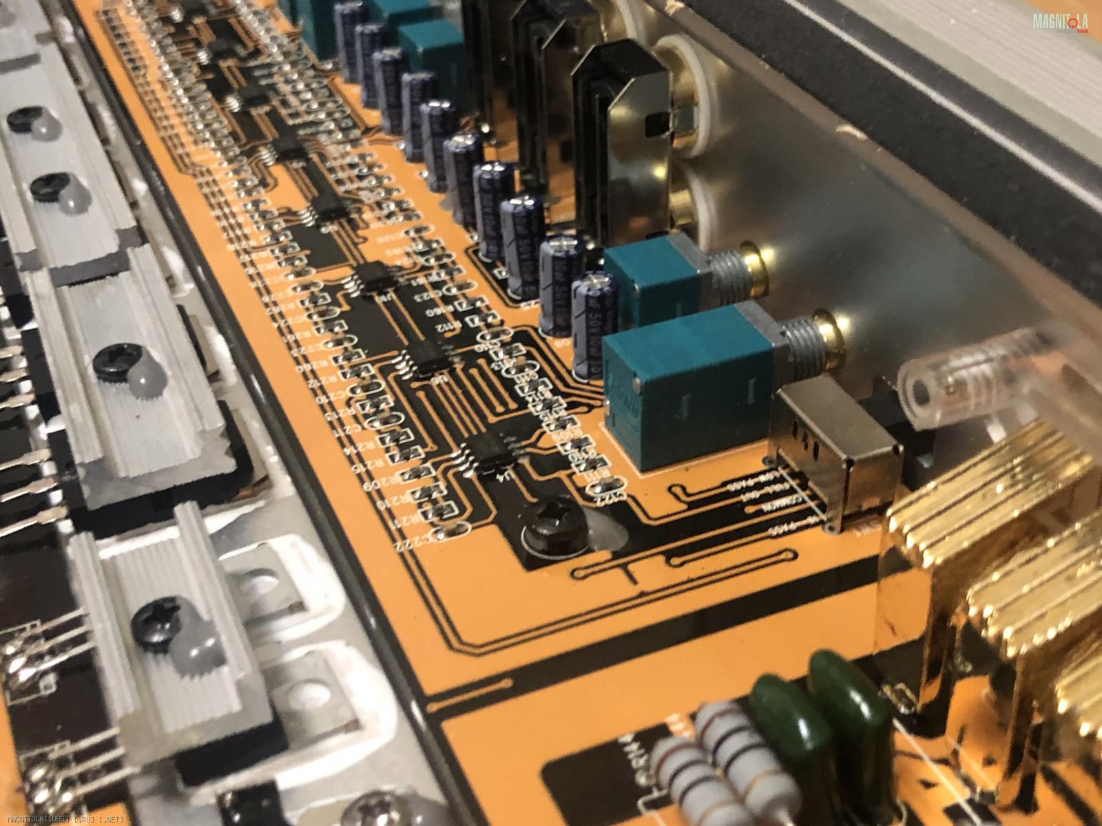 Мощный блок питания, два транса. Электролиты Cap-top (в других усилителях не встречал, судя по названию, ТОПовые), в блоке предусилителя 50 вольтовые, можно не бояться питать саб мостом. ОУ от STMicroelectronics.