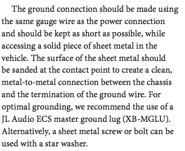 и кстати, стоит почитать мануал к усилителям - некоторые рекомендуют брать массу с АКБ, но некоторые рекомендуют брать массу как можно ближе от самого уся.... сам ради интереса смотрел мануалы.. вот например JLAudio....