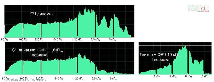Принцип раздела частот: разнеся частоты фильтров создать провал АЧХ на 150 Гц (НЧ резонанс салона) и на 2-3 кГц (максимальная чувствительность человеческого уха) и получить приемлемый тональный баланс без применения эквалайзера.