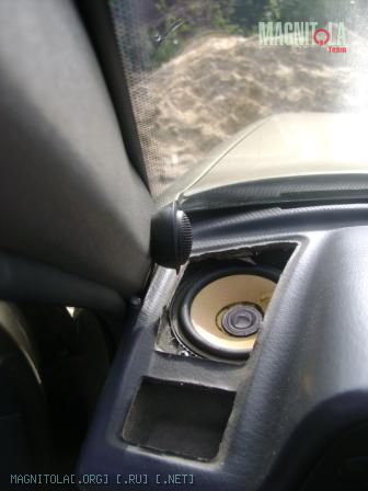 ВЧ установлены внизу стоек на двухстороннем скотче с максимальным доворотом в сторону лобового стекла, подключены к выходу FRONT головного устройства через конденсаторы 4 мкФ(I порядок фильтра, частота среза около 10 кГц). За счет отворота ослаблено действие на слушателя 10 кГц, на 6,3 кГц убираем эквалайзером.