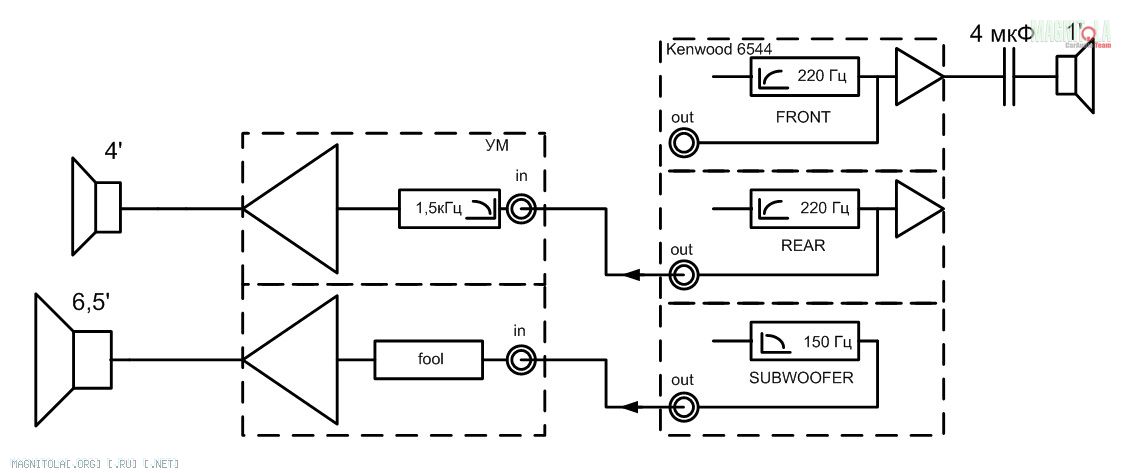 В теме описаны принципы и методы создания и настройки примитивной, но все-таки системы. С удовольствием послушаю рекомендации и комментарии, ежели у кого-нибудь хватит терпения прочитать. С уважением, Flatout. Исходные данные. Места установки штатные, 4’ в углах передней панели под стеклом и 6’ в задней полке. Двери – целомудренные. Коаксиалы достали впринципе, из-за невозможности настройки тонального баланса. Голова KENWOOD 6544 с упрощенной DSP, фильтры только сабвуферные 40-220 Гц, эквалайзер псевдопараметрический 3 полосы, 13 центральных частот через 2/3 октавы. В хозяйстве завалялся самодельный усилитель(кусок платы с микросхемой усилителя от почившей магнитолы CLARION 4х18Вт, на массивном алюминиевом радиаторе) внутри усилителя прикручен кусок гетинакса с торчащими контактами, что позволяет быстро спаять фильтры I или II порядка на любые частоты.