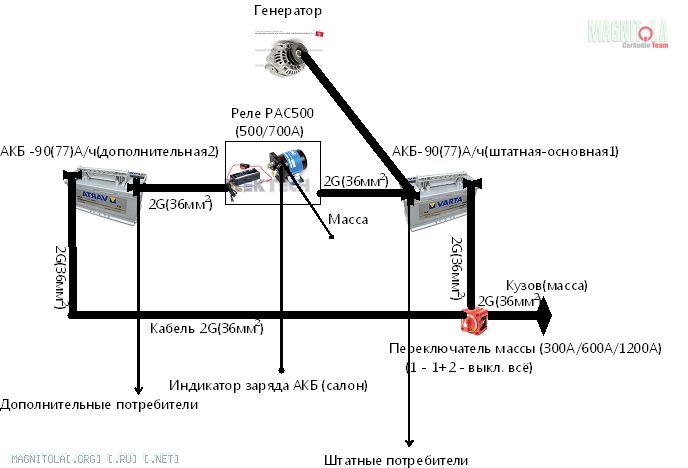 В смысле, при каком переключении? - как описано в инструкции к реле оно будет подключать второй аккумулятор на зарядку только если напряжение на нём упадёт , щас точно не вспомню - кажется до 11.8V, а первый будет работать в штатном режиме...А отключатель массы - там в ручную выбираешь нужное тебе положение 1) к массе подключен только основной аккумулятор 2) к массе подключены оба аккумулятора 3) всё выключено - можно идти домой.... Я не силён в электрике поэтому и задаю вопросы про надёжность данной схемы и безопасность...Да и там по моему в реле РAC 500 есть ещё дистанционная кнопка принудительного подключения... Меня беспокоит - не будут ли гореть провод на кузове массы если подключены оба аккумулятора и я запускаю двигатель - рекомендуемый стартерный ток для АКБ не менее 800А для моей машины...