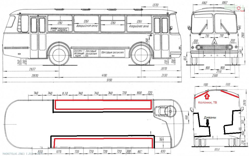 Сзади автобуса - туалет и барная стойка. Там не планировали акустику и ТВ. Но если очень надо, то можно и обдумать.