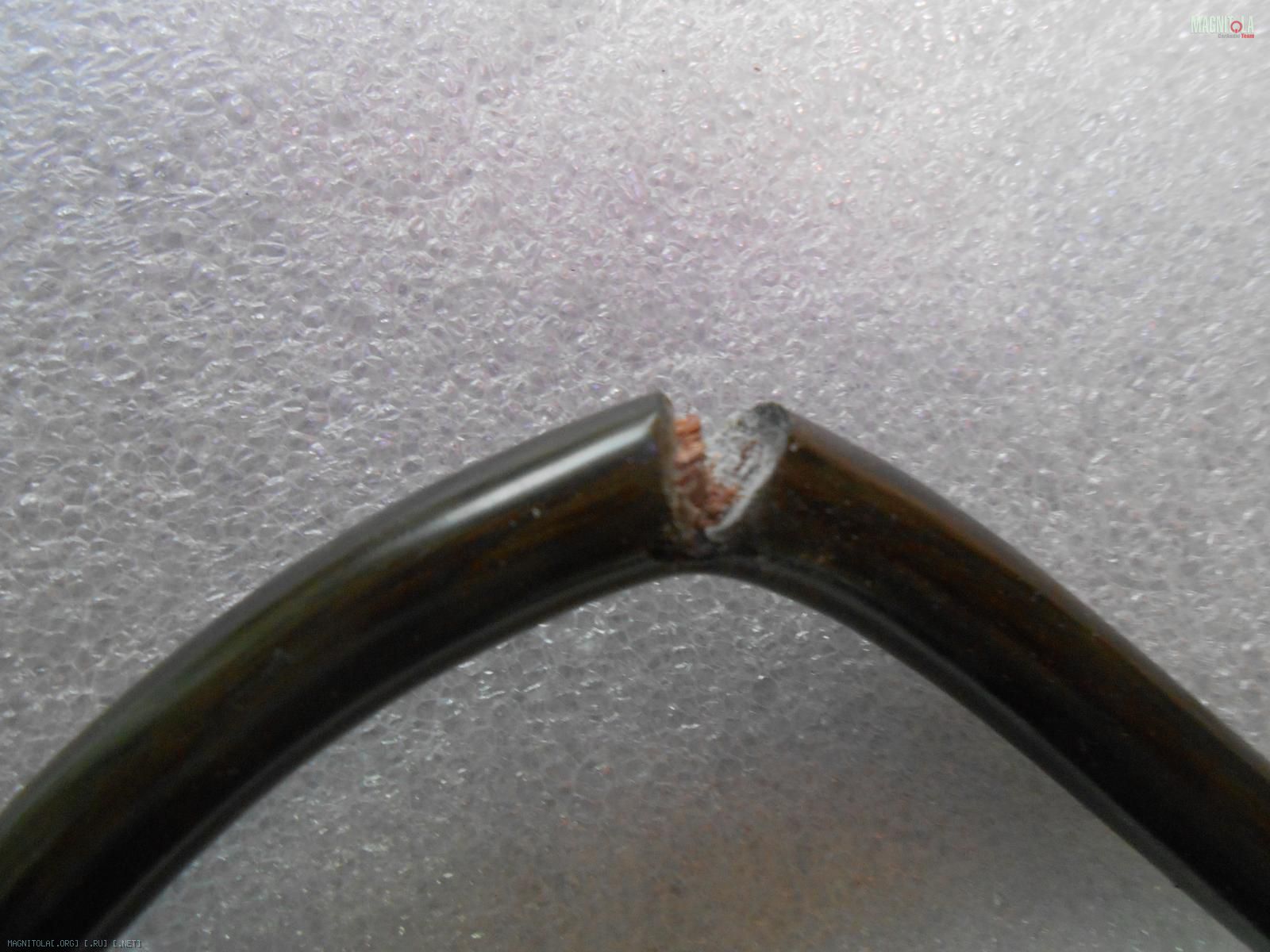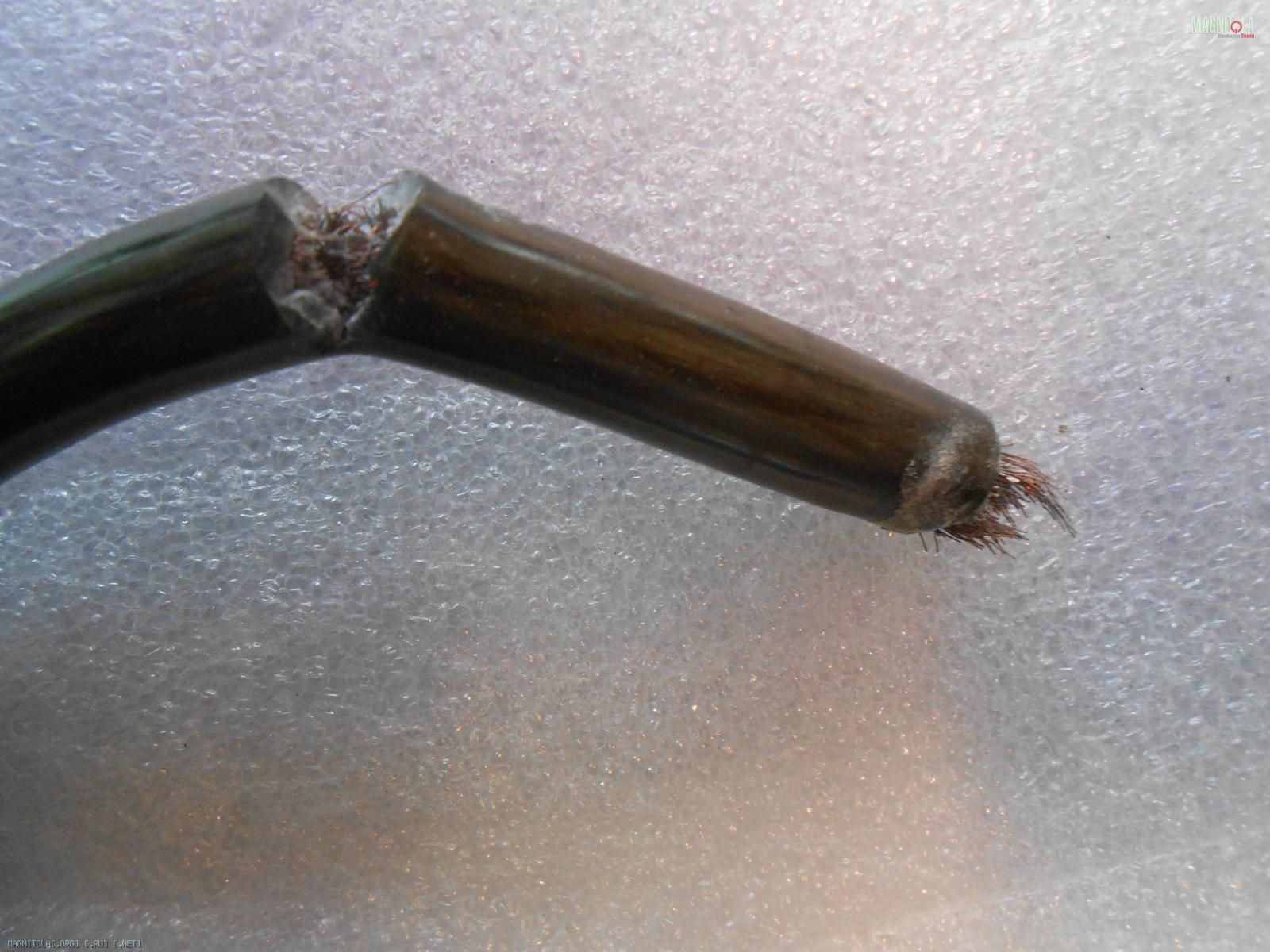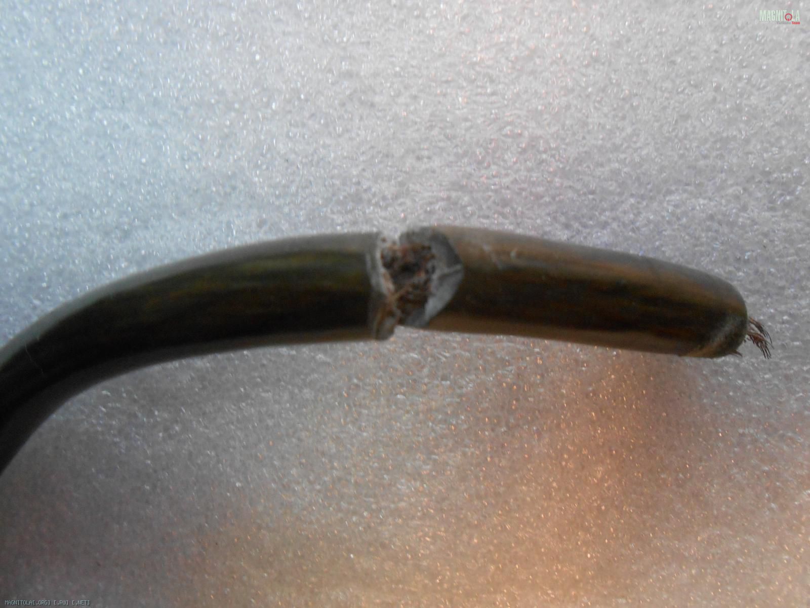 итог этого: был плохой провод массы на усилителе(надрезы сделаны для наглядности,чтобы было понятно то,что может быть не видно под изоляцией).Кстати напомню-соединение с клеммами было сделано пайкой,а не обжимом(что всегда предпочтительнее).Вот и получается-пайка есть,а кабеля нет.,