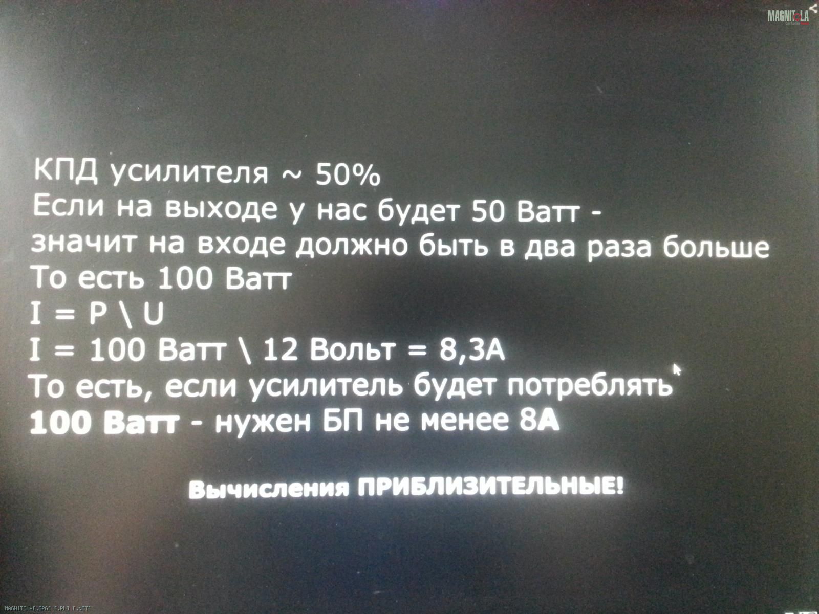 Ориентируясь на КПД усилителя (0,5 для АB и 0,8 для D) считаем необходимую мощность БП.