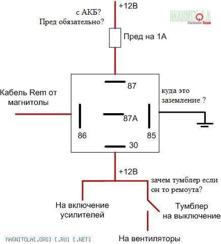От акб ведем плюс на контакт 87. А с 30- го контакта раздаем на потребители ( Рем усилителей, процев и вентиляторы). Но советую вентиляторы подключить через реле, а Рем усилителей оставить от ГУ
