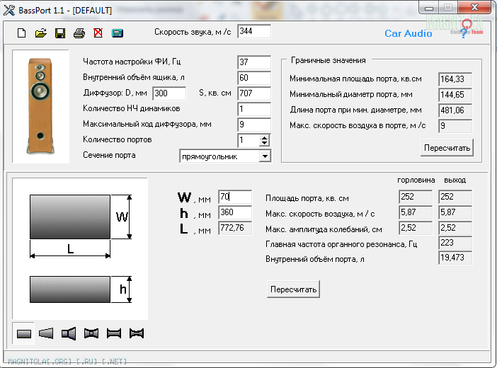 В АЗ только объем и настройка написаны, по ним и пересчитаю сейчас(из моих 60л в их 55л, с 37гц на 32гц, и диаметр дифузора переставлю с 300 на 260)