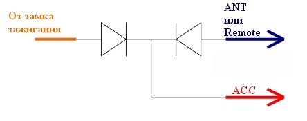Для чего там реле, если достаточно двух диодов??? Магнитола останется включенной после снятия ACC, но если ее выключить, то включение только при помощи ключа зажигания.