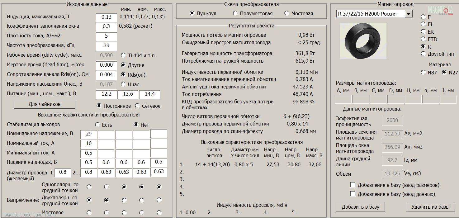 Как писал выше намотал я транс на кольцо что было, тем что оказалось под рукой)) кольцо R 37\22\15, проволока эмаль 0.75..0.8мм Если спецом покупать, то я бы выбрал кольцо побольше, чтобы провода мотать поменьше... например кольцо R 40\25\22 (это из табличных колец программки ExellentIT расчёта обмоток тр-ра)