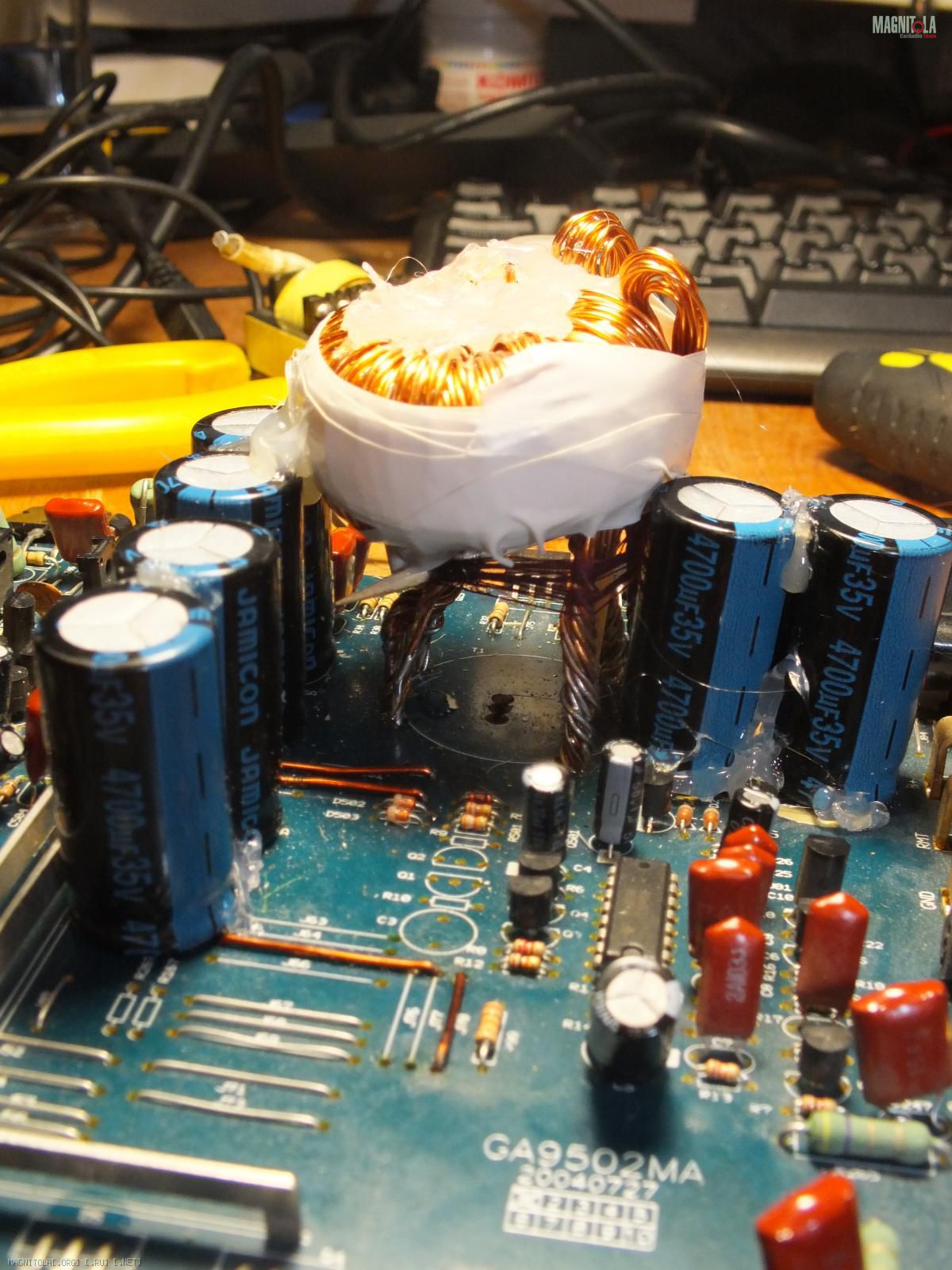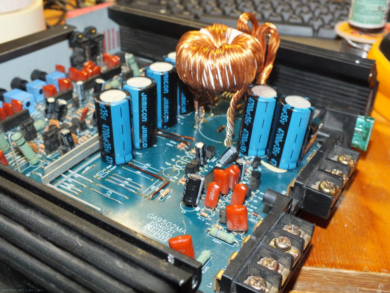 6) осталось залить чем нибудь типа термоклея или парафина...)) Кондёры выпирают за крышку, а транс тем более.. Думаю усилок развернуть "кишками" в короб саба, что думаете звук сильно пострадает?