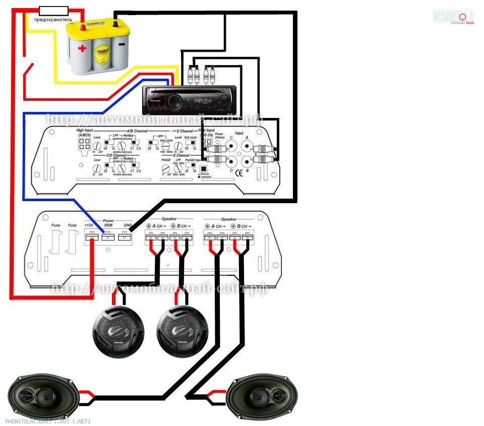 Пищалки подсоединяешь через последовательное подключение с имеющимся из комплекта конденсатором (потом заменить на другой-несложно) на тыловые(!) каналы гу подрезав снизу. 16-на усилитель,подрезав сверху и снизу. Пионеры режешь сверху,запустив их в режиме сабвуфера.