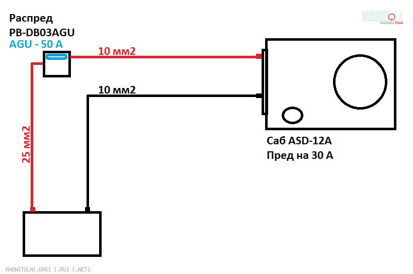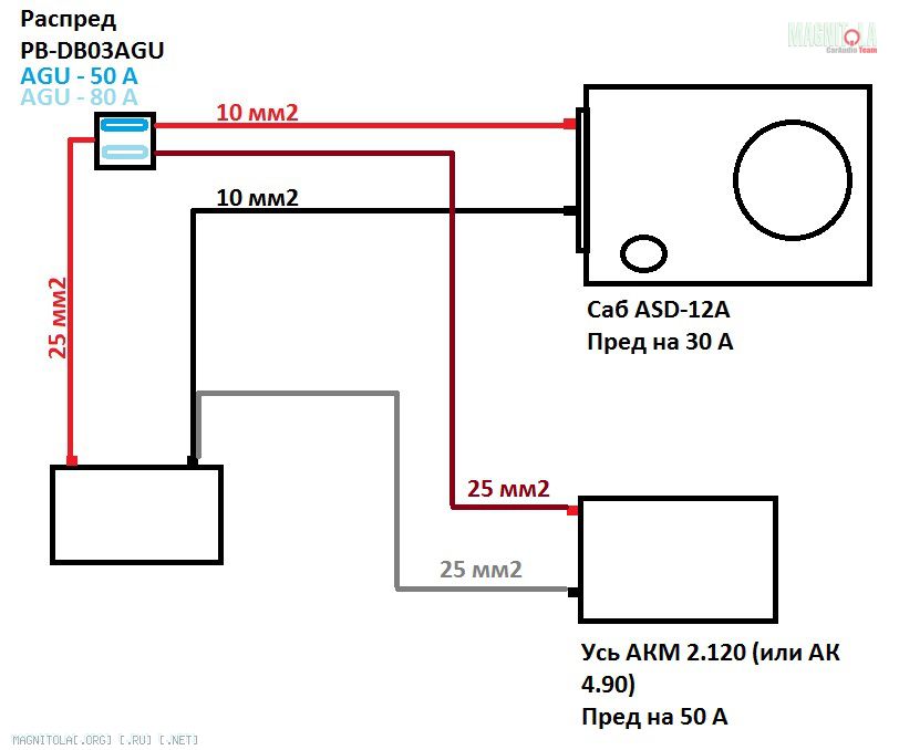 Еще забыл сказать-если используете схему как на 2 рисунке-на второй усилитель можете тоже 10 квадратов протянуть после распредблока.Если не более 3 м его будет достаточно,ну и предохранитель на 40-50А.