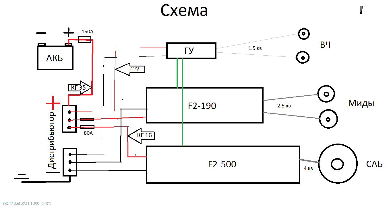 Накидал схемку подключения, гляньте все ли верно сделано ? И еще один дурацкий вопрос: если я подключу ВЧ через магнитолу (высокоуровневый разьем), я смогу порезать полосу и сделать временные задержки или это можно делать только через линейные выходы ? И какое сечение силового кабеля взять для подключения ГУ ?