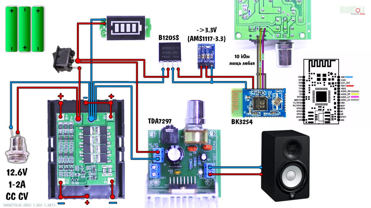 Хочу сделать блютуз колонку, 2 Нч, 2 Вч. С питанием от 3 аккумов (12 в).