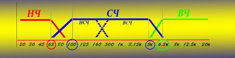 В итоге нашел схему, где наглядно показано, что и как, и взял ее за основу, так как наглядность дала понимание процесса, а именно - саб сверху обрезать на 63-70, миды снизу на 90-100. Я поставил примерно 65 на сабе и 85 на мидах, на слух (куда ж без этого) на хорошем треке немного подогнал состыковку по частотам, поиграл немного гейном - все стало идеально.