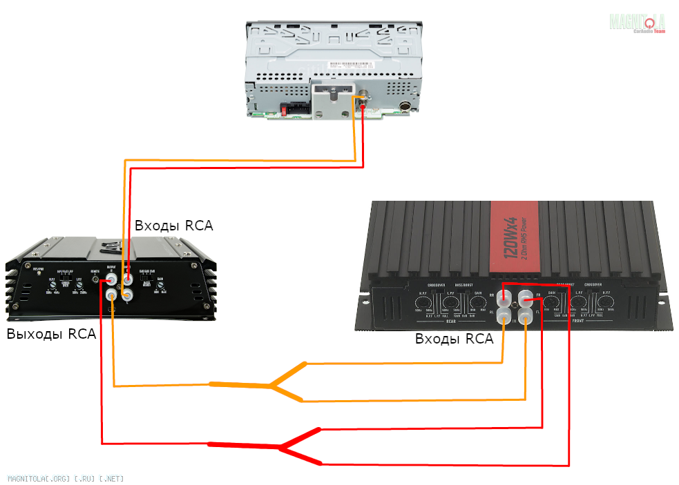 У магнитолы один линейный выход RCA, он пойдет на усилитель сабвуфера, у которого есть и вход и выход RCA.
