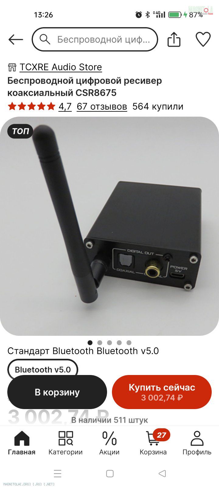 С телефона по блютуз на эту штуку, а эту штуку короткой оптикой в процессор. Вложение 1363459