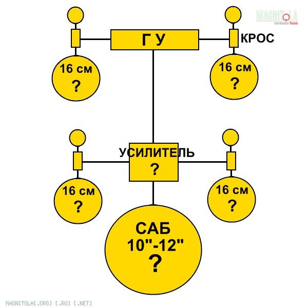 Вот такую систему я себе придумал и выбрал,опираясь на ваши советы!Помогите с выбором компонентов для этой системы и вариантами подключения их между собой!Расчитываю уложится тысяч в 30-40 только на компоненты без ГУ,ШВИ и Фанеры.ГУ будет SONY,PIONEER или JVC.Слушать в основном буду техно и то что по радио Энергия крутят и аудио книги.Собрать систему хочу нормальную и чтобы не пришлось её переделывать.Эксперементировать не люблю да и денег особо нет на это,просто хочу получить хорошее объёмное звучание с приличными басами.