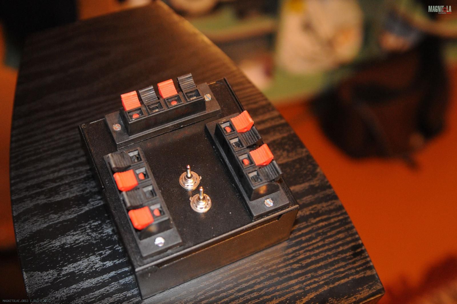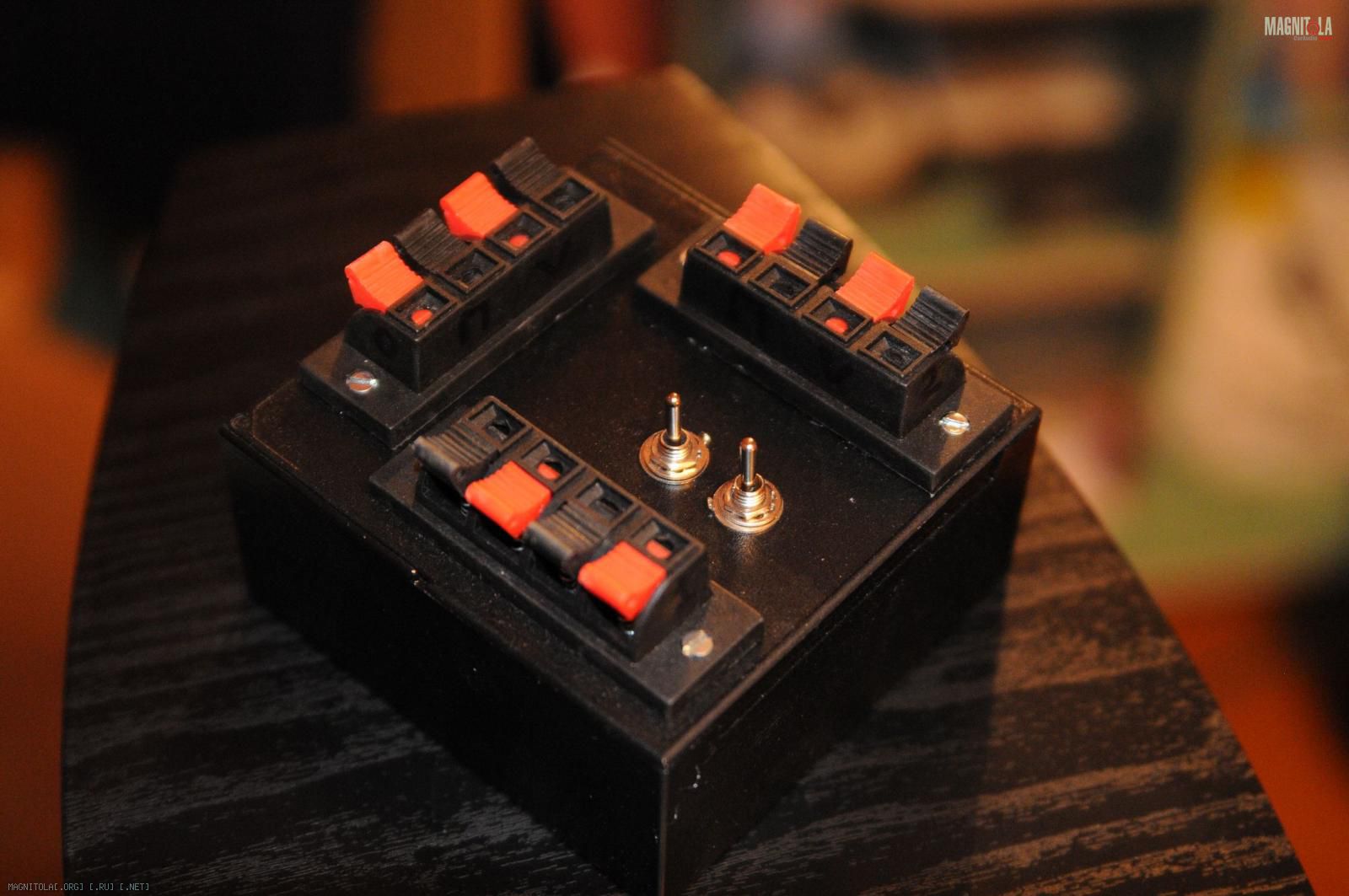 Получился такой "компаратор" уровня "юный электротехник". Основа - коробочка от дискет 1.44, +3 разъема для акустики, + 2 трехпозиционных переключателя.