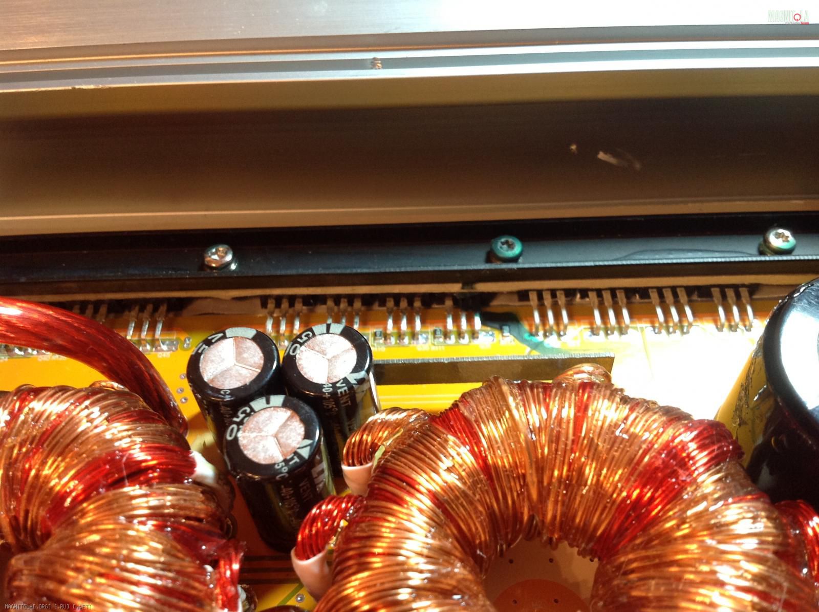 Лака на обмотках трансформатора маловато.Ощущение,что его снюхали китайцы,которые,потом эти самые трансформаторы и мотали)))Транс намотан до такой степени неаккуратно и неплотно,что местами просто плакать хочется(( На фото это видно не сильно,но если придется сталкиваться с ними вживую,то сами все увидите.Причина банальна: вибрации.Так как намотан транс неплотно-обмотки не жестко зафиксированы между собой,что приводит к трению.В конце концов изоляционный лак просто стирается и происходит межвитковое КЗ